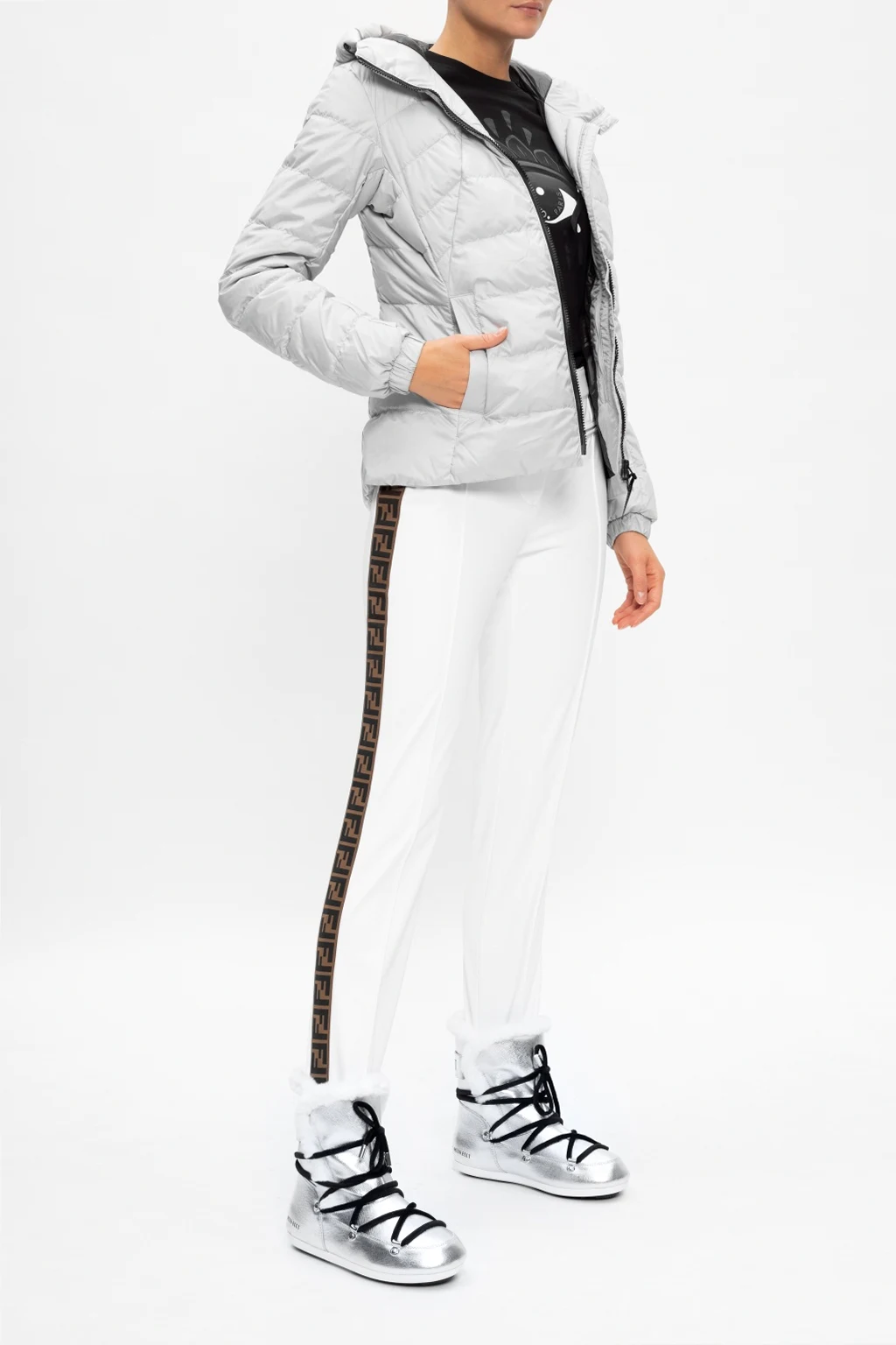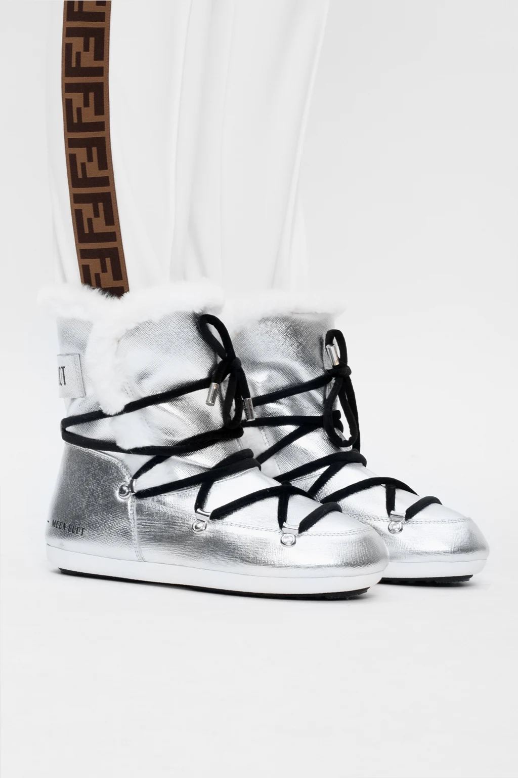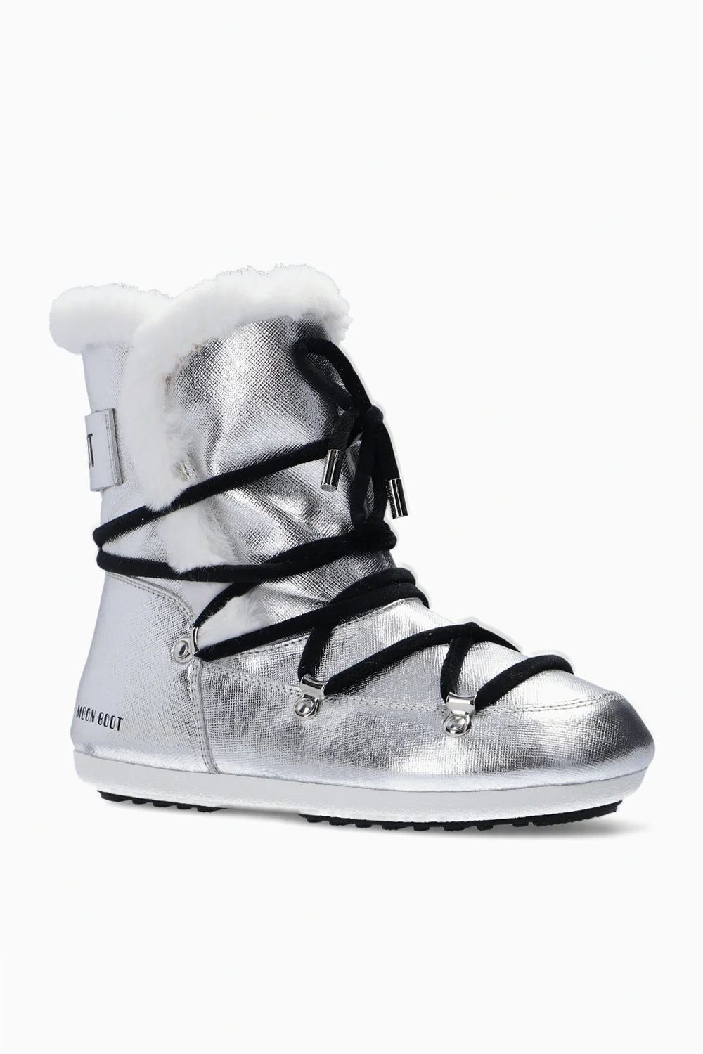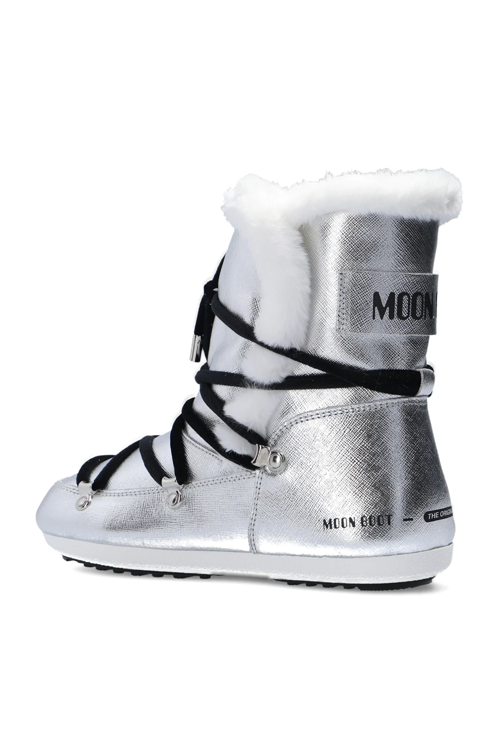 Sznurowane, wodoodporne śniegowce w kolorze srebrnym, model ‘Dark Side High Saffiano’ Moon Boot. Na górze ściągane trokami. Ozdobione naszywką z logo w kolorze czarnym. Czarna, gumowa podeszwa.