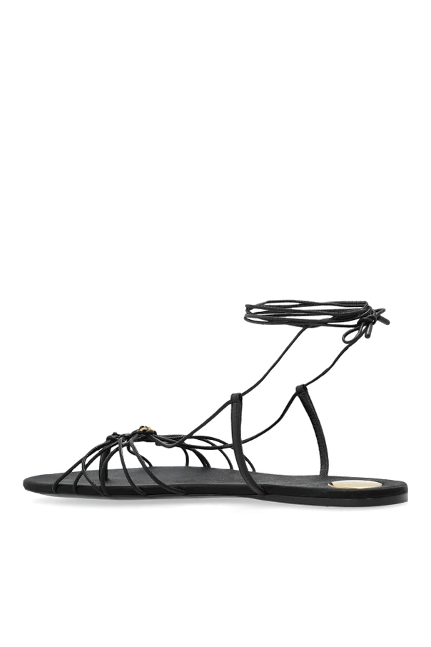 Na przodzie sandałów umieszczono ozdobny element z logo projektanta, co stanowi wyrafinowany akcent podkreślający ich markowy charakter. Dominujący czarny kolor nadaje im uniwersalności, czyniąc je idealnym dodatkiem do różnorodnych stylizacji, zarówno casualowych, jak i boho.