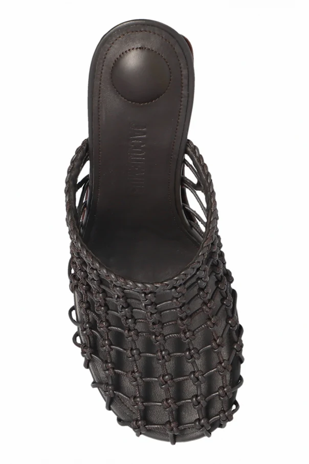 Odkryj subtelną elegancję klapek na obcasie Les Doubles Tresses od renomowanego projektanta Jacquemus . Te wyjątkowe sandały, utrzymane w dominującej brązowej kolorystyce, łączą w sobie wyrafinowany styl z niepowtarzalnym komfortem noszenia.