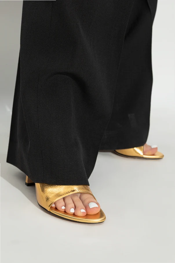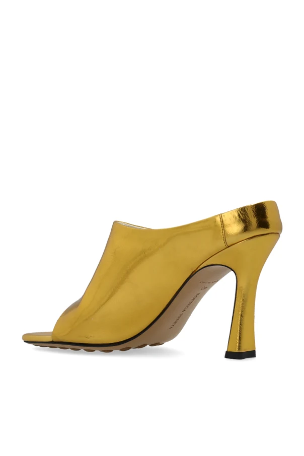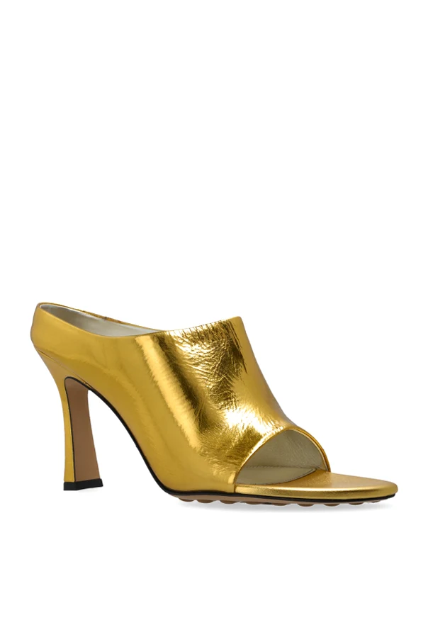 Przedstawiamy Klapki na obcasie "Rana" , niezrównane dzieło sztuki od Bottega Veneta. Oferują one nie tylko stylowy wygląd, ale także wygodę na co dzień. Dzięki smukłemu, średniej wysokości obcasowi i odkrytej pięcie, uzyskują one niesamowicie elegancki profil. Wyróżniają się gładką powierzchnią w złotym kolorze , co emanuje luksusem i wytwornością.