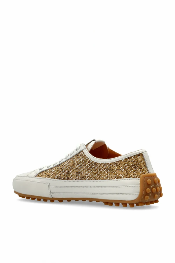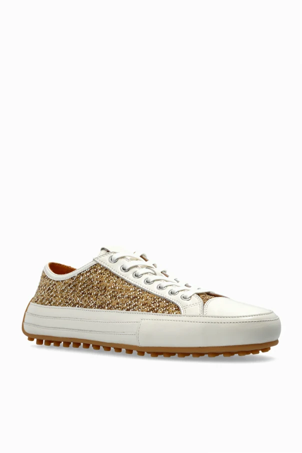 Pleciony materiał bocznych paneli w odcieniach brązu komponuje się z białą skórą, która zdobi przód, piętę oraz okolice oczek na sznurowadła, podkreślając wystawny charakter produktu. Tłoczone logo projektanta na języku dodaje prestiżu, a podwyższona podeszwa z gumy o karbowanej strukturze zapewnia doskonałą przyczepność.