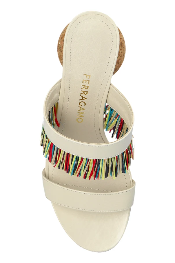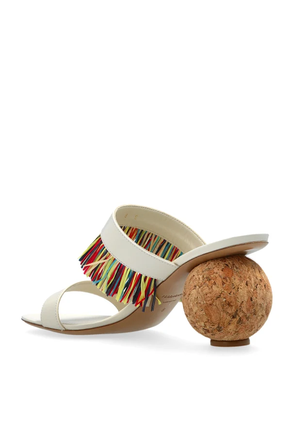 Klapki wykonano z kremowej skóry , zdobionej dwoma paskami, z których jeden ozdobiony jest kolorowymi frędzlami, dodającymi wyrazistości i artystycznego akcentu. Nietuzinkowy obcas o kulistym kształcie , wykonany z korka, łączy nowoczesność z elegancją, oferując niepowtarzalny design i styl. Na górnej części wkładki znajduje się złote logo marki, akcentujące designerski charakter produktu.