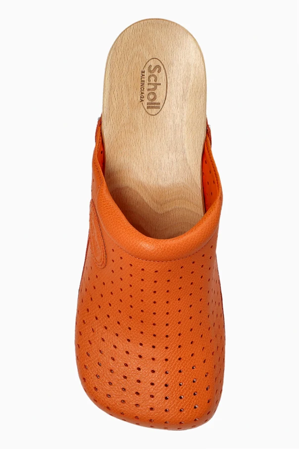 Balenciaga x Scholl to harmonijne połączenie ponadczasowego kunsztu haute couture z nowoczesnym wzornictwem. Klasyczny fason sabotów typu slip-on, z lekko zaokrąglonym, zamkniętym noskiem oraz odsłoniętą piętą, wyraża subtelną elegancję i nowatorstwo. Wyjątkowa cholewka wykonana z naturalnej skóry została subtelnie perforowana, zapewniając niezwykłą przewiewność oraz oryginalną estetykę.