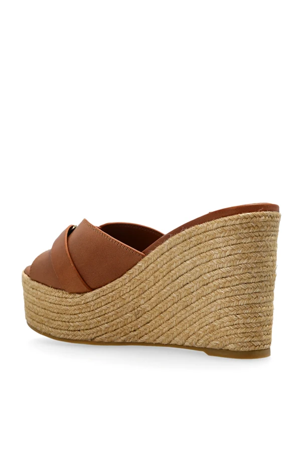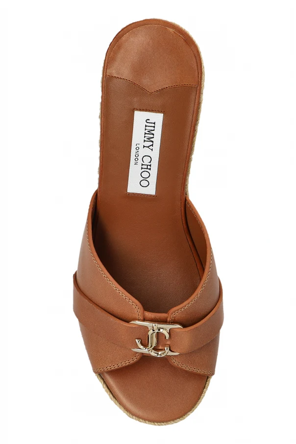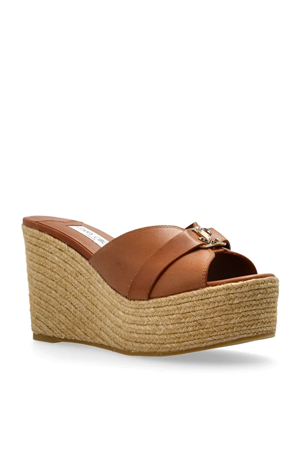 Klapki na koturnie Leda od Jimmy Choo to przykład wyrafinowanego połączenia klasy oraz nowoczesności. Imponująca konstrukcja oparta na wysokim, plecionym koturnie inspirowanym stylem espadryli subtelnie wydłuża sylwetkę, dodając elegancji każdemu krokowi. Szeroka cholewka wykonana z najlepszej, naturalnej skóry w odcieniu głębokiego brązu szkliście otula przód stopy, pozostawiając palce delikatnie odsłonięte.