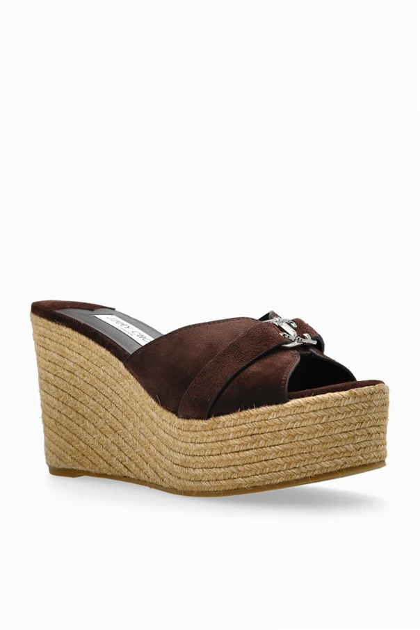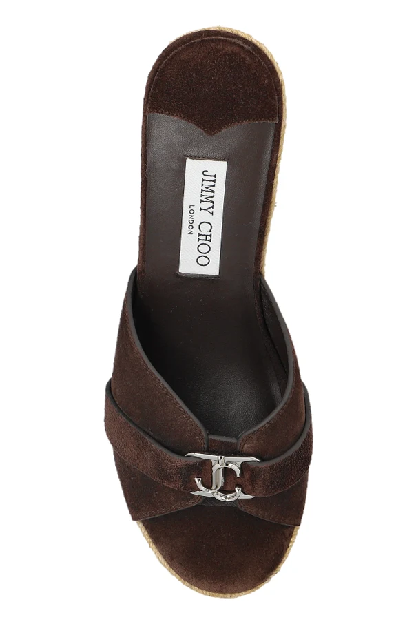 Klapki na koturnie Leda to kwintesencja wyrafinowanego stylu, łącząca ponadczasową elegancję z unikatowym rzemiosłem słynnego domu mody Jimmy Choo. Starannie wykonana cholewka z miękkiego, brązowego zamszu zachwyca matowym wykończeniem oraz wyjątkową strukturą, subtelnie podkreśloną dekoracyjnymi przeszyciami.