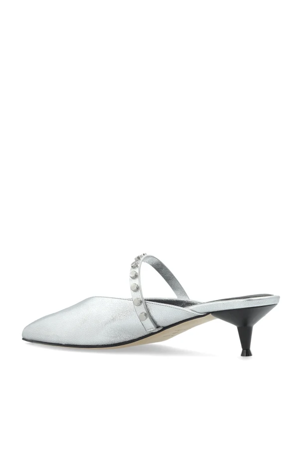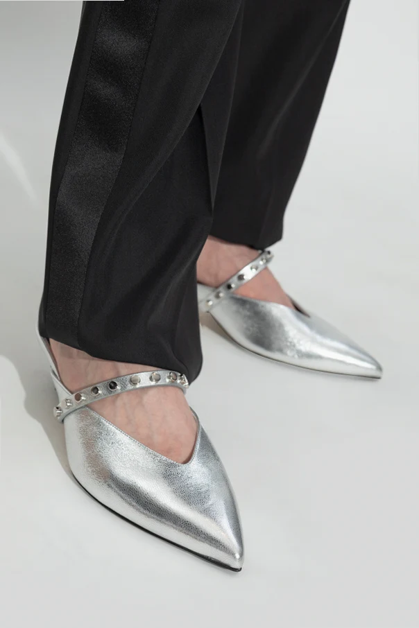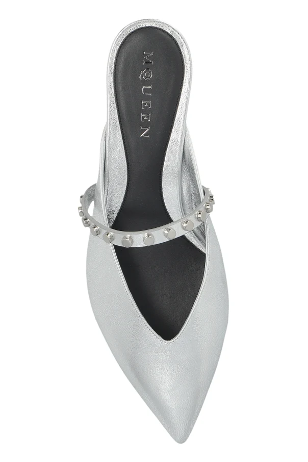 Pojedynczy pasek na śródstopiu, zdobiony szeregiem srebrnych ćwieków, podkreśla unikatowość projektu, a tłoczone logo "McQUEEN" na wkładce staje się subtelnym znakiem luksusu.