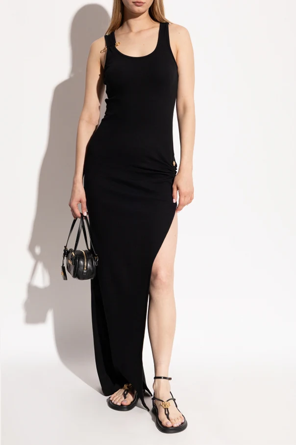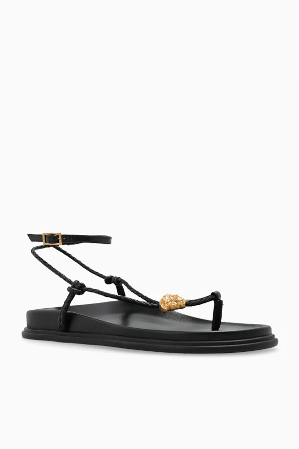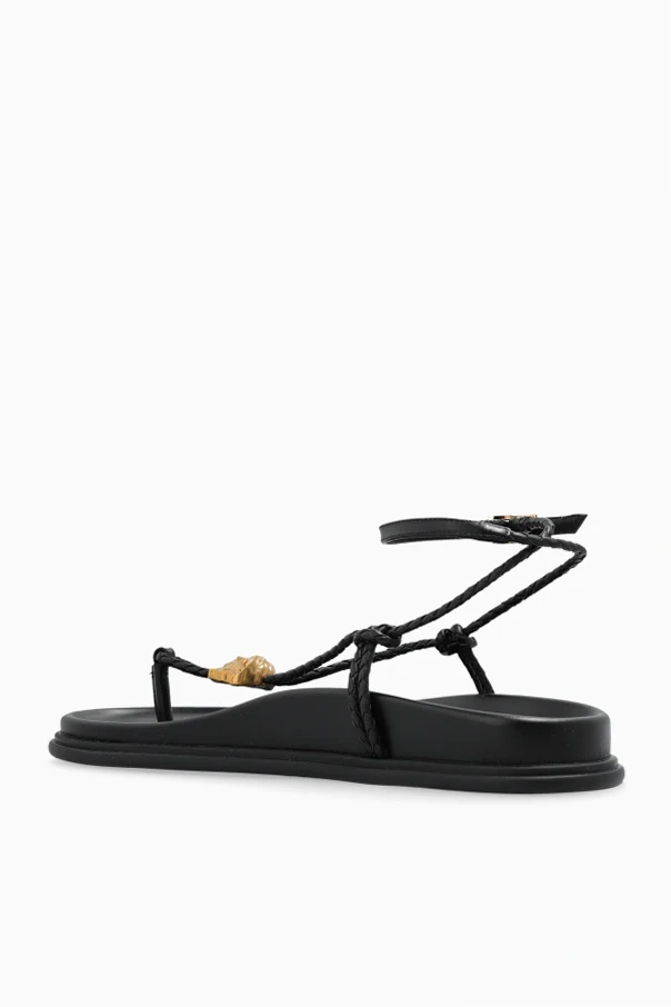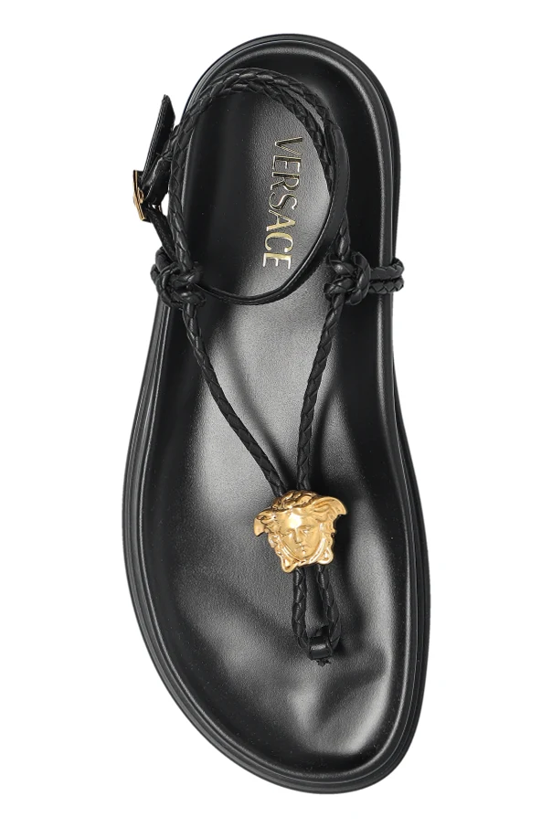Skórzane sandały z głową Meduzy tworzą wysublimowaną kompozycję klasyki oraz nowoczesności, będąc kwintesencją niepowtarzalnego stylu domu mody Versace. Wykonane z wyselekcjonowanej, gładkiej skóry, przyciągają uwagę wyrafinowanym, plecionym układem pasków oplatającym śródstopie i kostkę.