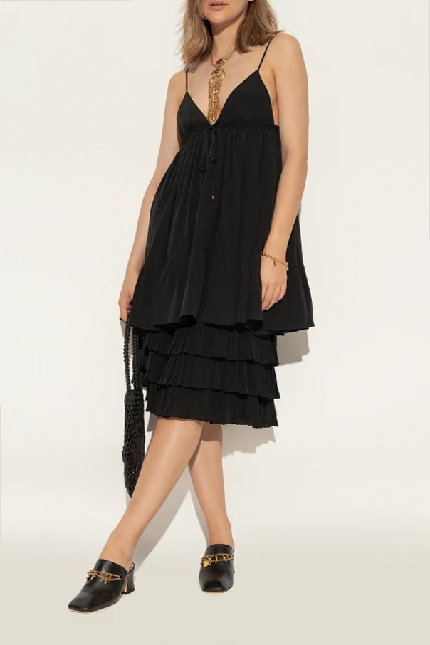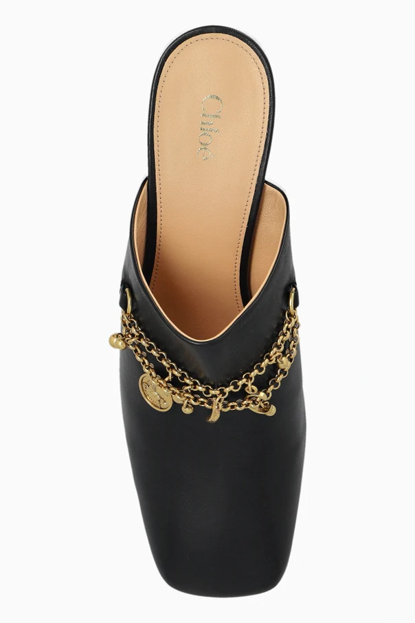 Wierzch butów zdobi wysokogatunkowa, czarna skóra licowa, której naturalny połysk harmonijnie współgra z jasną, skórzaną podszewką sygnowaną logo projektanta. O unikatowości tego modelu decyduje złoty łańcuszek z brelokami – motyw przewodni kolekcji – precyzyjnie ułożony na cholewce, wśród których wyróżnia się zawieszka z wytłoczonym logo Chloé.