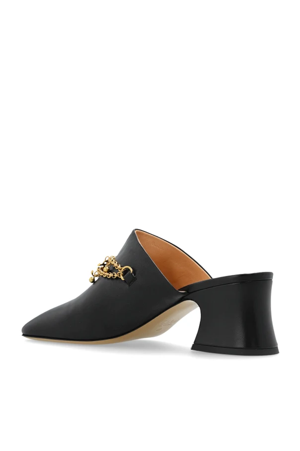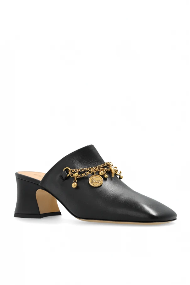 Klapki na obcasie „Charms” z ekskluzywnej kolekcji Chloé to kunsztowny hołd dla wyrafinowanej estetyki oraz współczesnej kobiecości. Model wyróżnia się zamkniętym czubkiem o subtelnie kwadratowym wykończeniu i obcasem w formie eleganckiego, zwężanego słupka, podkreślającym lekkość sylwetki.
