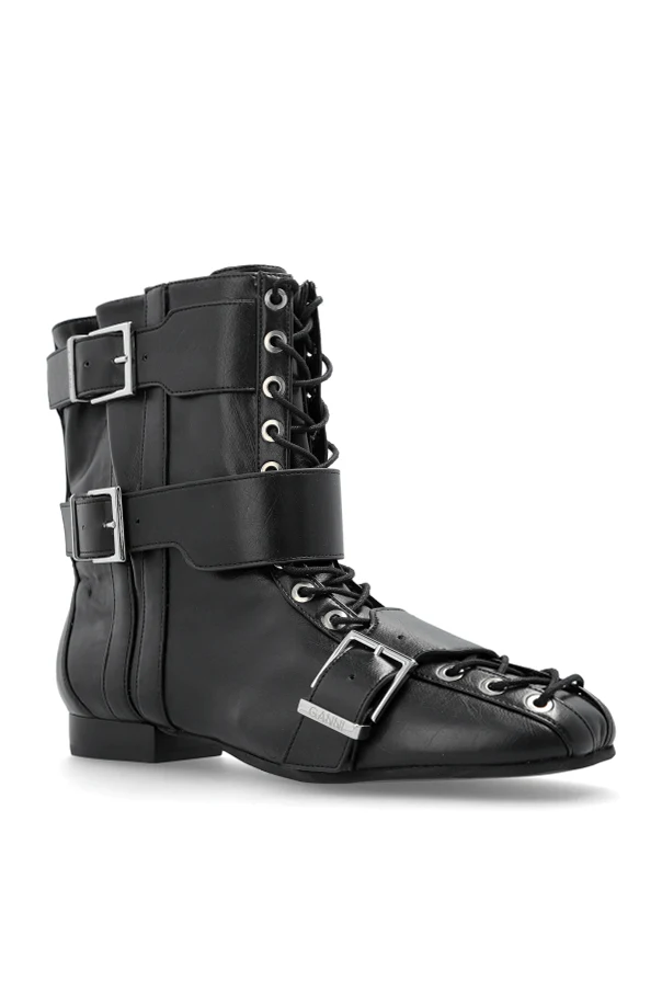 Botki z eco skóry od GANNI to esencja nowoczesnej elegancji w wydaniu codziennym. Wykonane z subtelnie połyskującej, czarnej skóry wegańskiej, wyróżniają się lekko szpiczastym czubkiem oraz płaską, komfortową podeszwą, tworząc ponadczasowy kształt sięgający za kostkę.