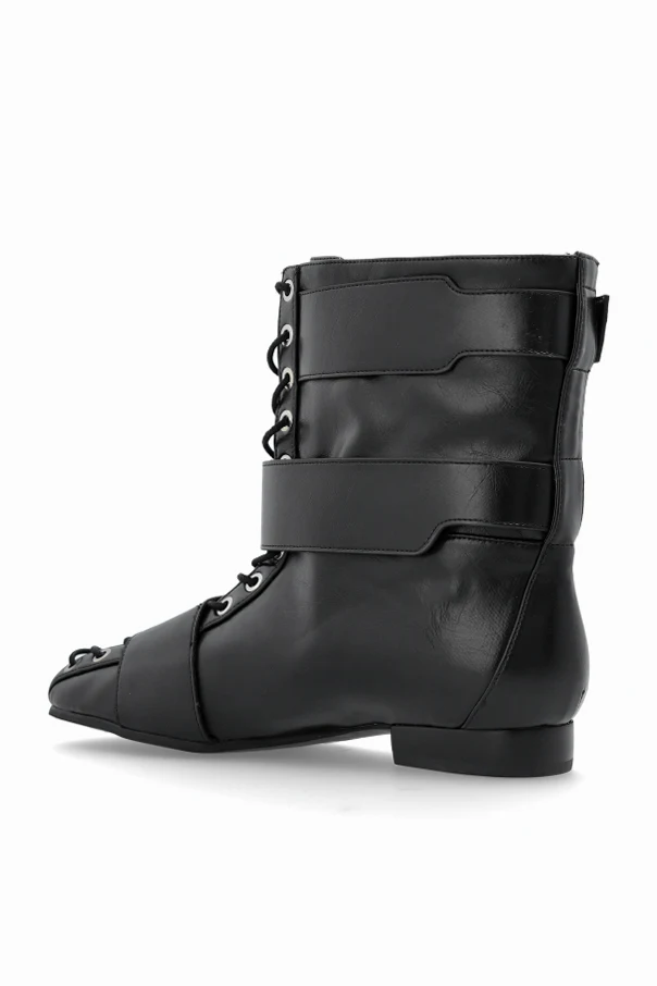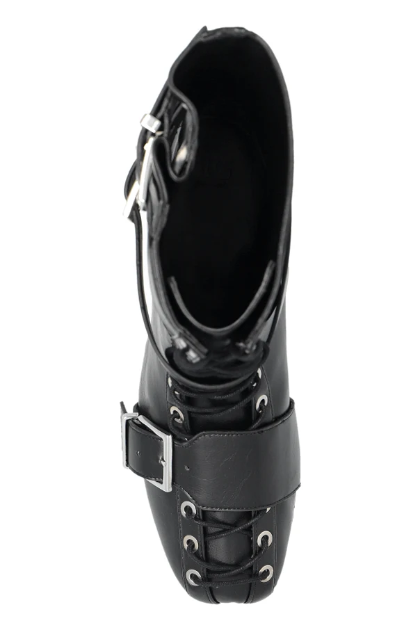 Unikalny charakter podkreśla nietuzinkowe połączenie sznurowania przez ozdobne metalowe oczka na całej długości cholewki z szerokimi, poziomymi paskami, zwieńczonymi wyrazistymi, srebrnymi klamrami. Detale te harmonijnie łączą funkcjonalność z wyszukaną estetyką, czyniąc ten model wyrazem indywidualnego stylu.