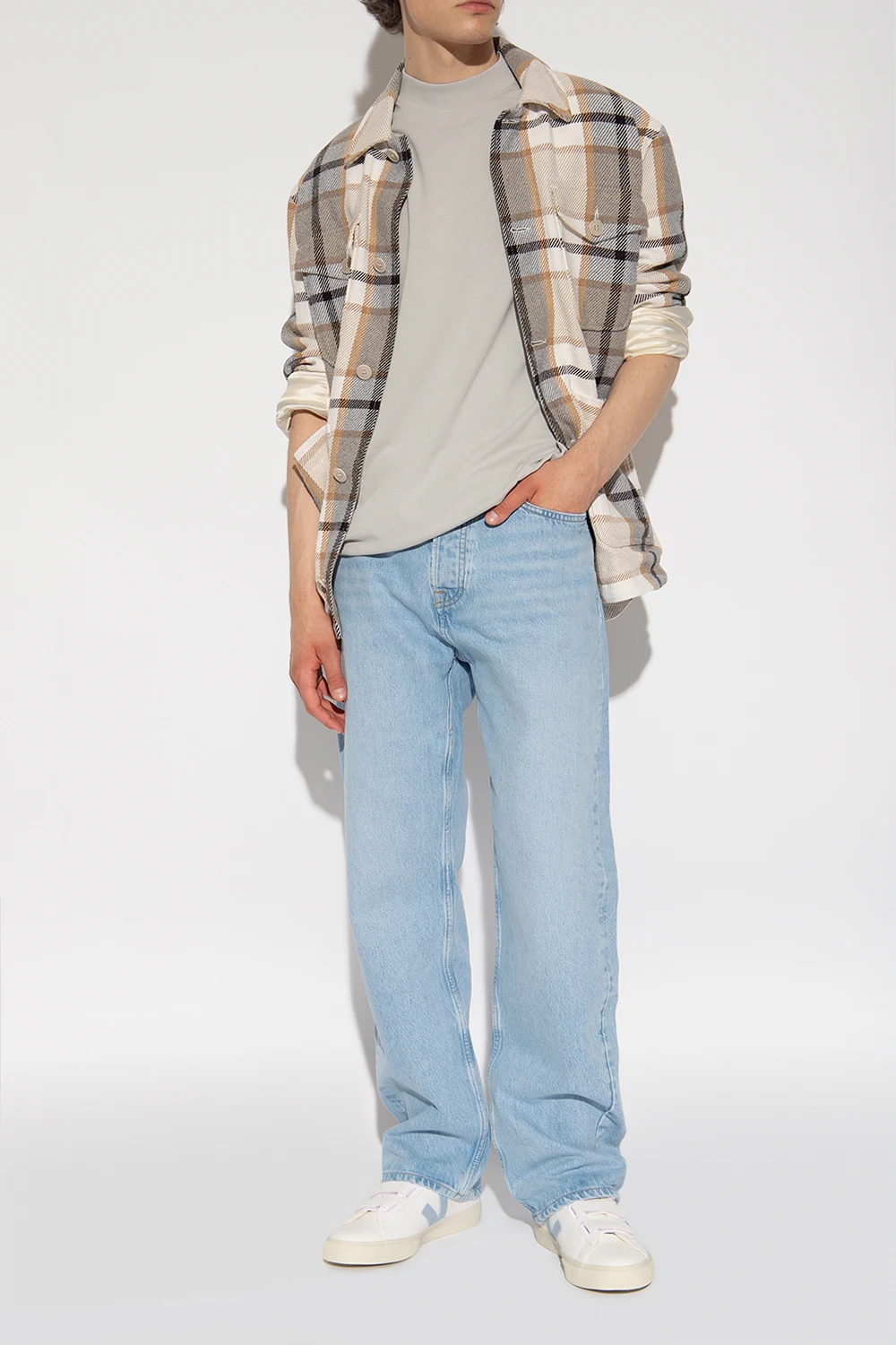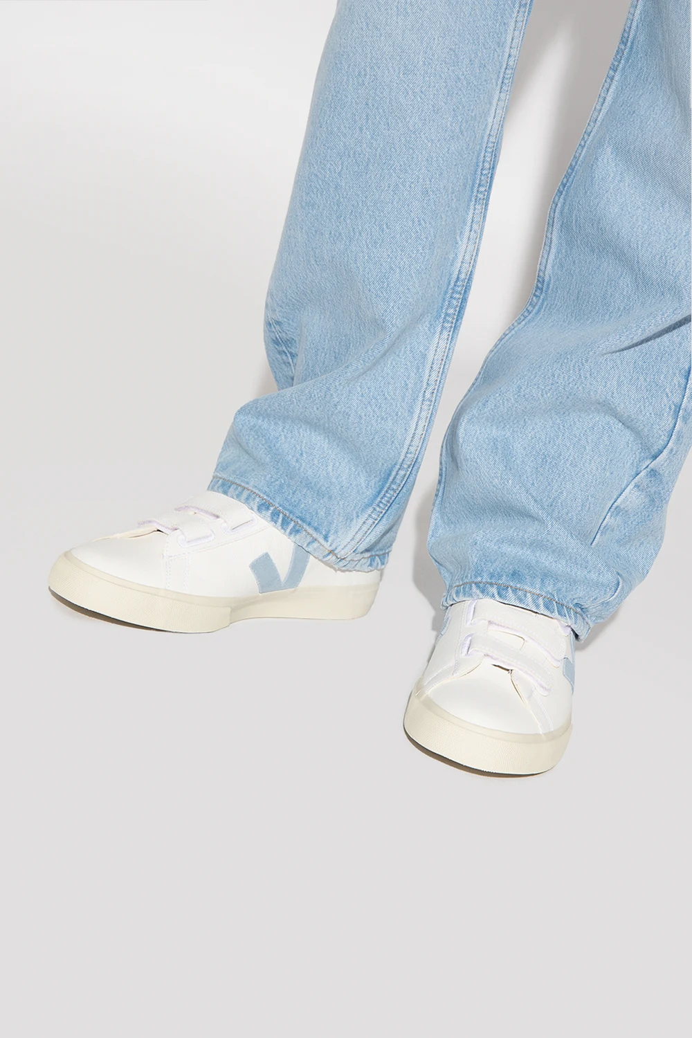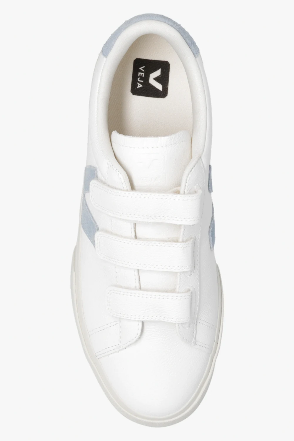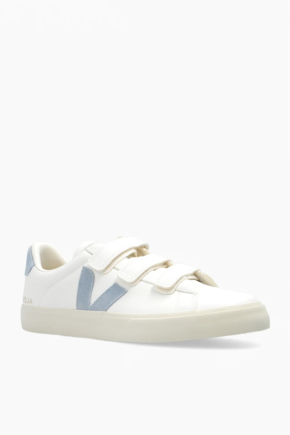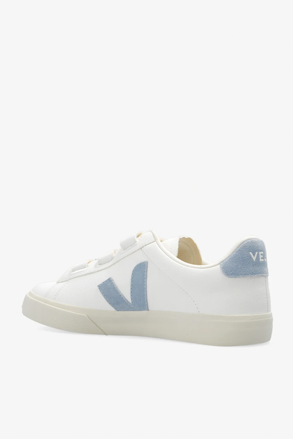 Białe buty sportowe, model ‘Recife’ Veja. Wykonane ze skóry bez użycia chromu. Zapinane na potrójne rzepy. Na języku wytłoczone logo. Charakterystyczna dla marki naszywka w kolorze jasnoniebieskim wykonana z gumy oraz odpadów ryżowych. Warstwa wewnętrzna o specjalnej, siateczkowej strukturze wykonana z materiału pochodzącego z recyklingu – cechuje się wyjątkową odpornością na tarcie. Wkładka wykonana z trzciny cukrowej, gumy Amazon, bawełny organicznej i pochodzącej z recyklingu pianki EVA. Kremowa, gumowa podeszwa wykonana z materiałów organicznym oraz pochodzących z recyklingu.