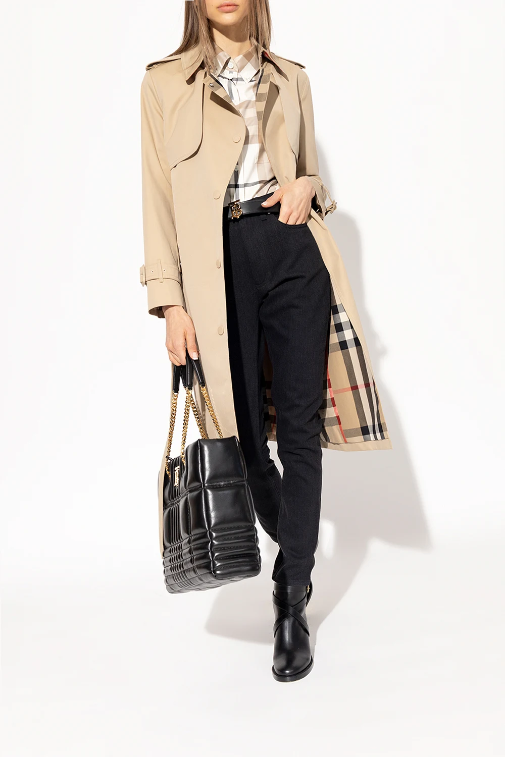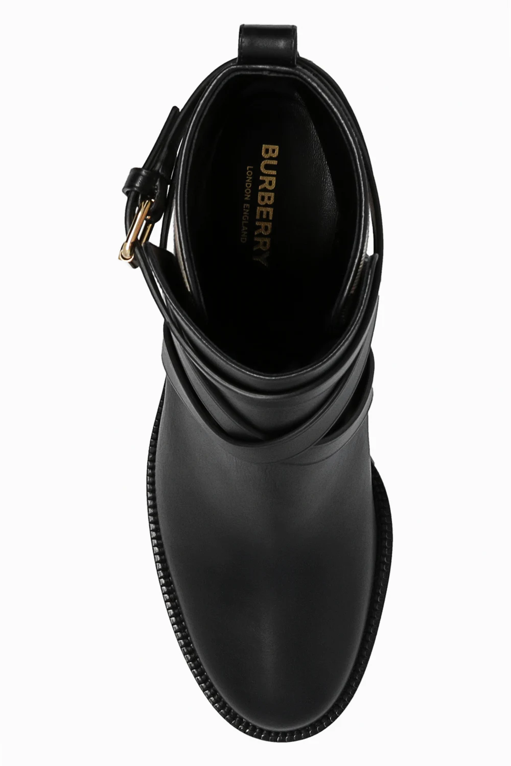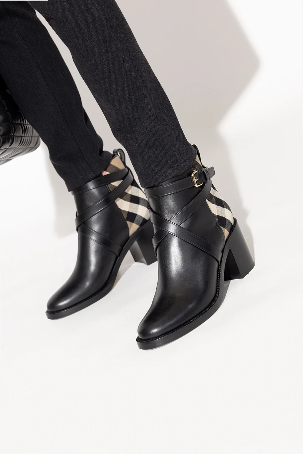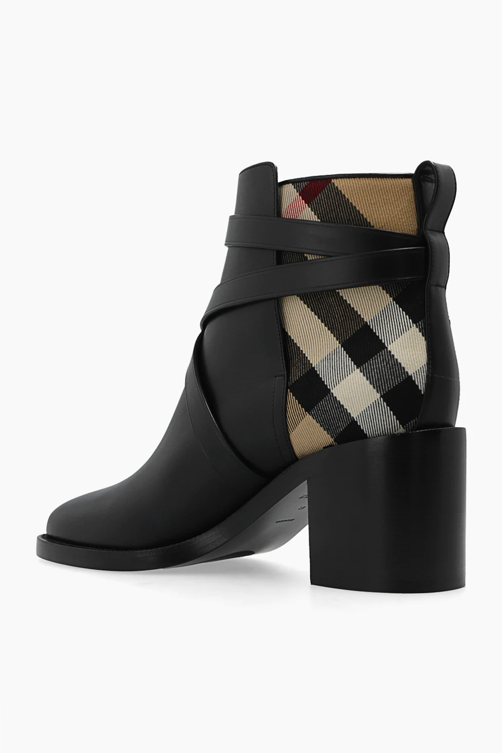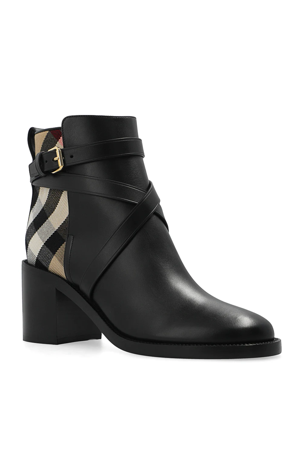 Czarne, wsuwane botki na obcasie, model ‘New Pryle’ Burberry. Wykonane ze skóry i wykończone beżowym płótnem ozdobionym wzorem w charakterystyczną dla marki kratę w kolorze biało-czarno-czerwonym. Wokół kostki regulowany pasek z klamrą. Zaokrąglony nosek. Czarna, skórzana podeszwa wykończona gumą.