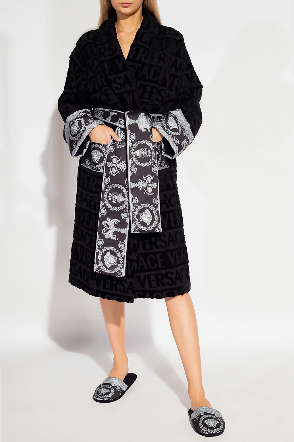 Czarny szlafrok Versace Home. Wykonany z bawełny. Ozdobiony wzorem z logo. Wykończony szarym wzorem ‘Barocco’. W pasie wiązany paskiem. Dwie wsuwane kieszenie. Długie rękawy.