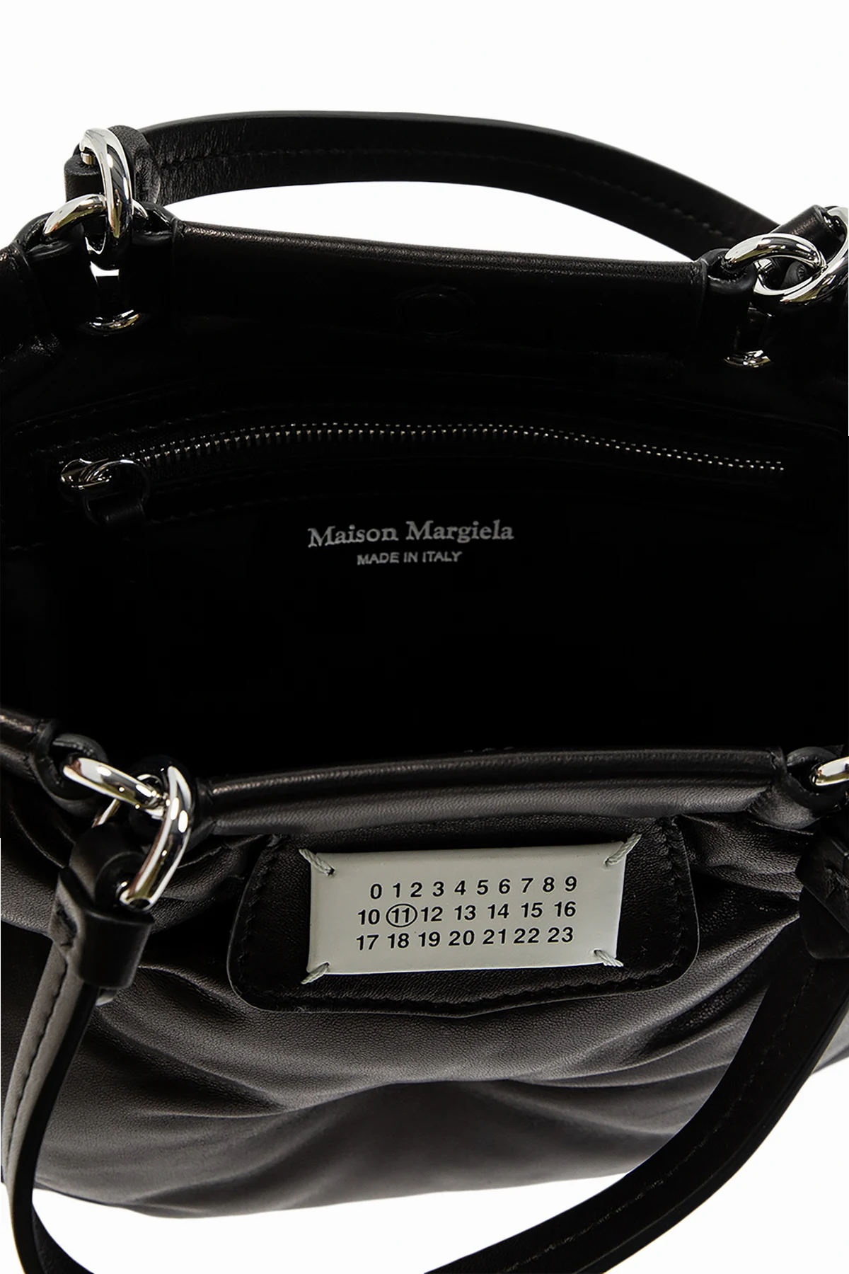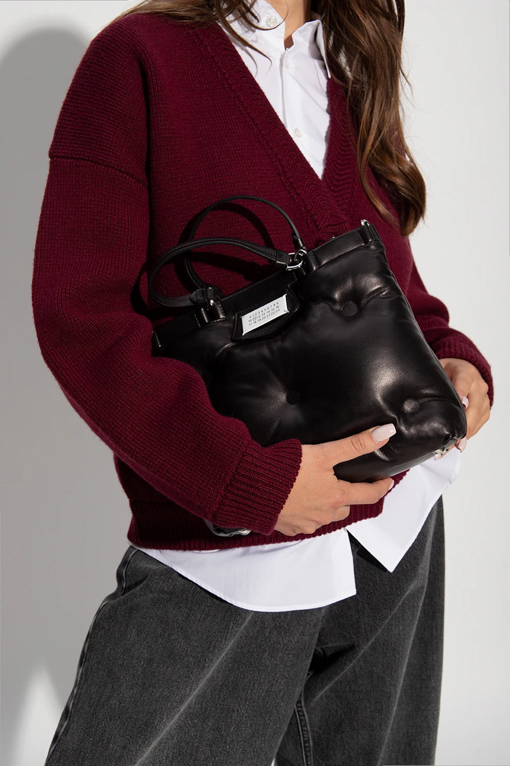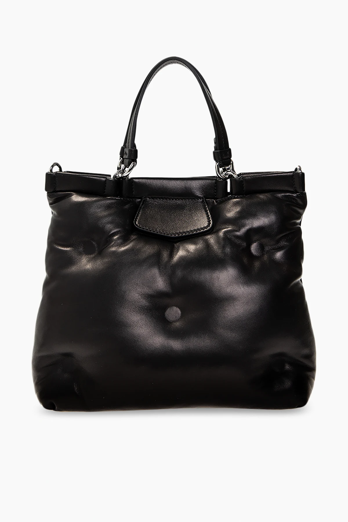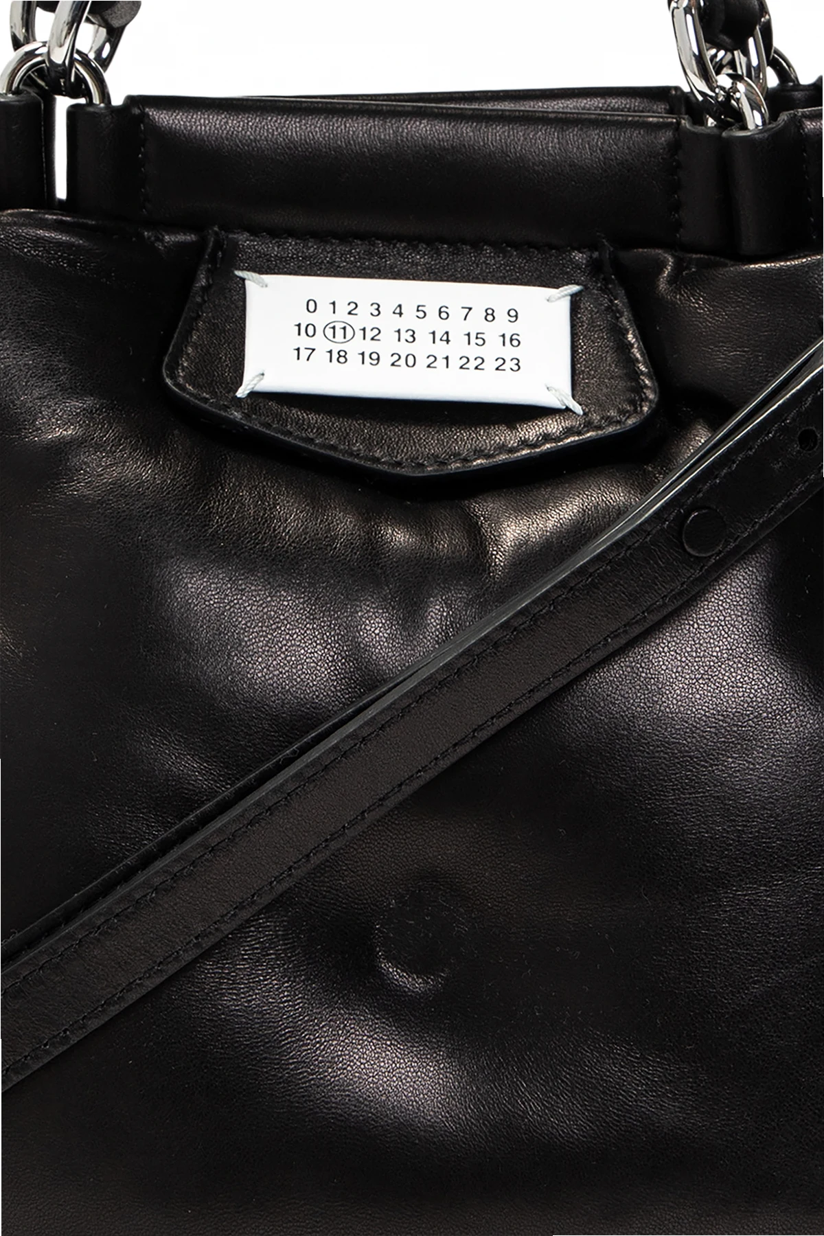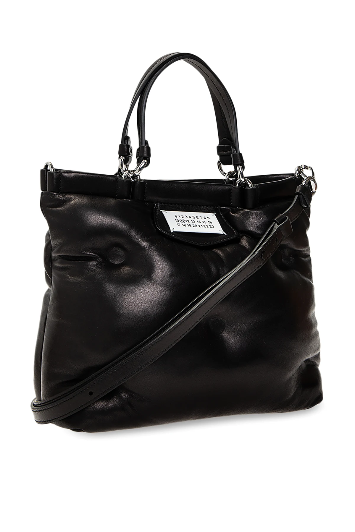 Czarna, skórzana, pikowana torba na ramię, model 'Glam Slam' Maison Margiela. Zamykana na magnetyczne zapięcie. Z przodu ozdobiona aplikacją z logo w kolorze biało-czarnym. Dwie, półokrągłe rączki. Odpinany pasek z możliwością regulacji długości. Wewnątrz komora z kieszenią zamykaną na zamek. Metalowe elementy w kolorze srebrnym.