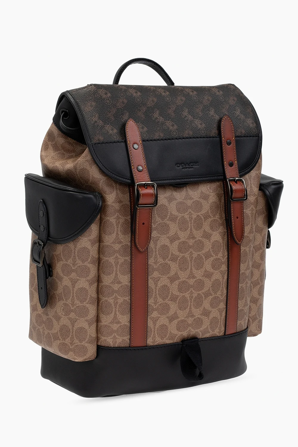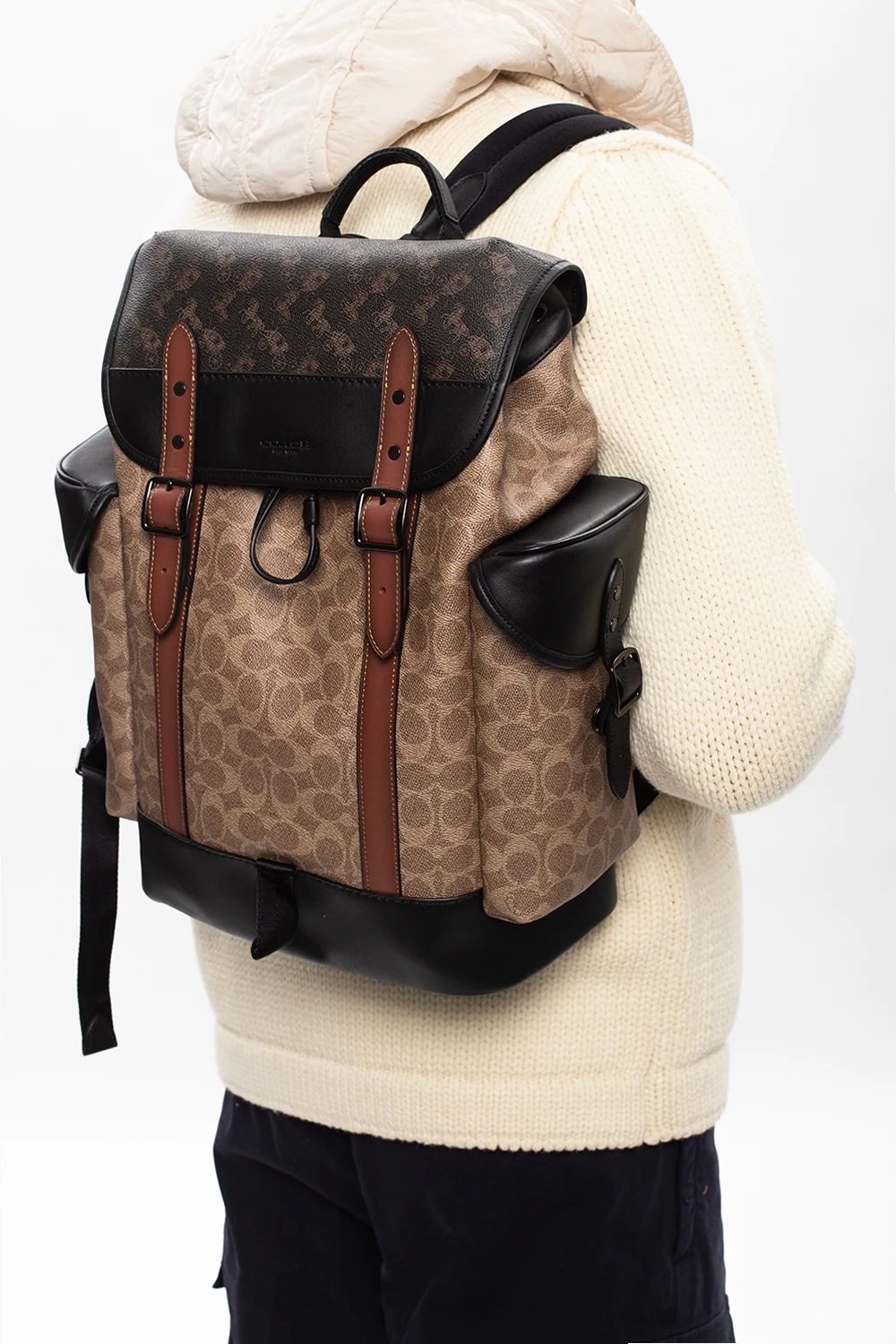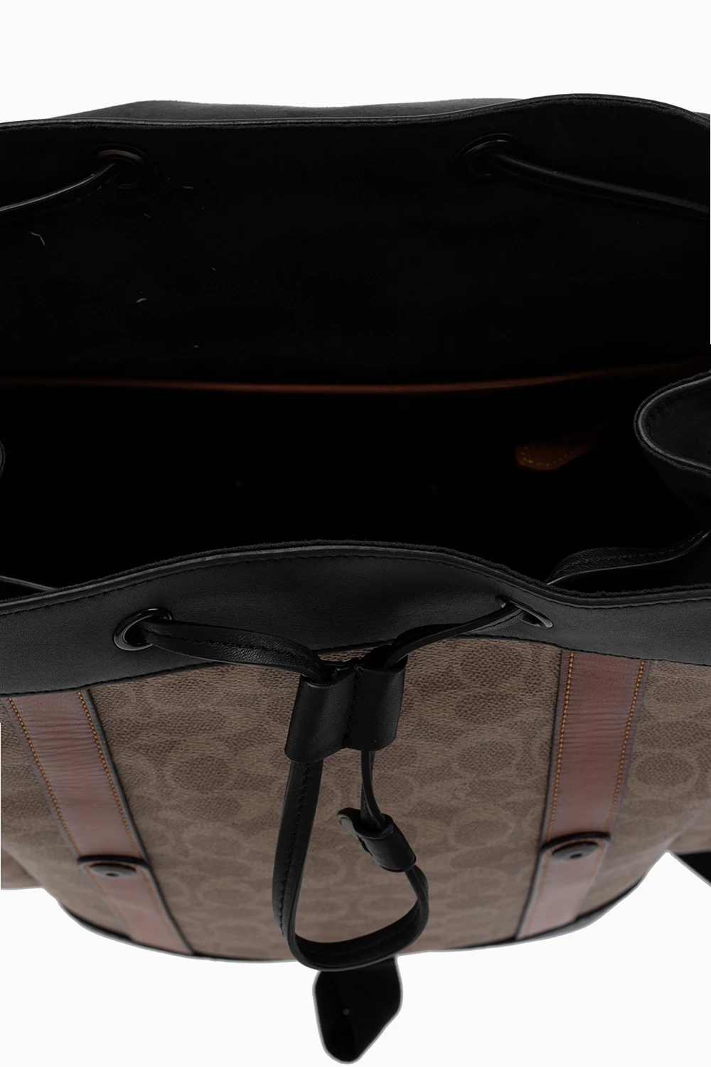 Beżowo-brązowo-czarny plecak Coach. Wykonany z płótna. Wykończony skórą. Zamykany na zatrzaski oraz ściągany trokami. Ozdobiony wytłoczonym i nadrukowanym logo oraz charakterystycznym dla marki nadrukiem. Po bokach dwie kieszenie z patką zamykane na zatrzask. Półokrągła rączka. Odpinany pasek na ramię z możliwością regulacji długości. Wewnątrz komora, trzy wsuwane kieszenie oraz kieszeń zamykana na zamek.