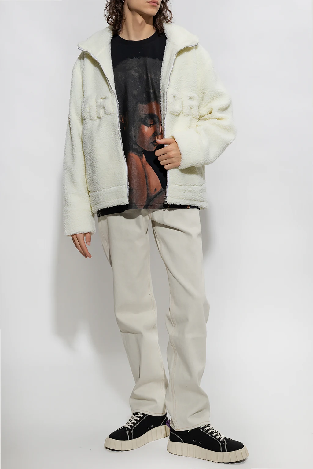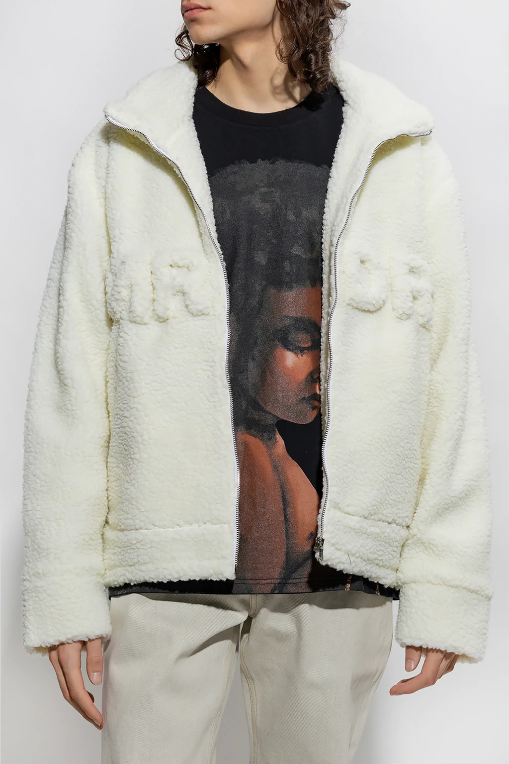 Kremowa, polarowa kurtka Who Decides War. Zapinana na zamek. Z przodu naszywki tworzące napis ‘MRDR’. Dekolt wykończony stójką. Dwie wsuwane kieszenie. Długie rękawy oraz dół wykończone ściągaczem.