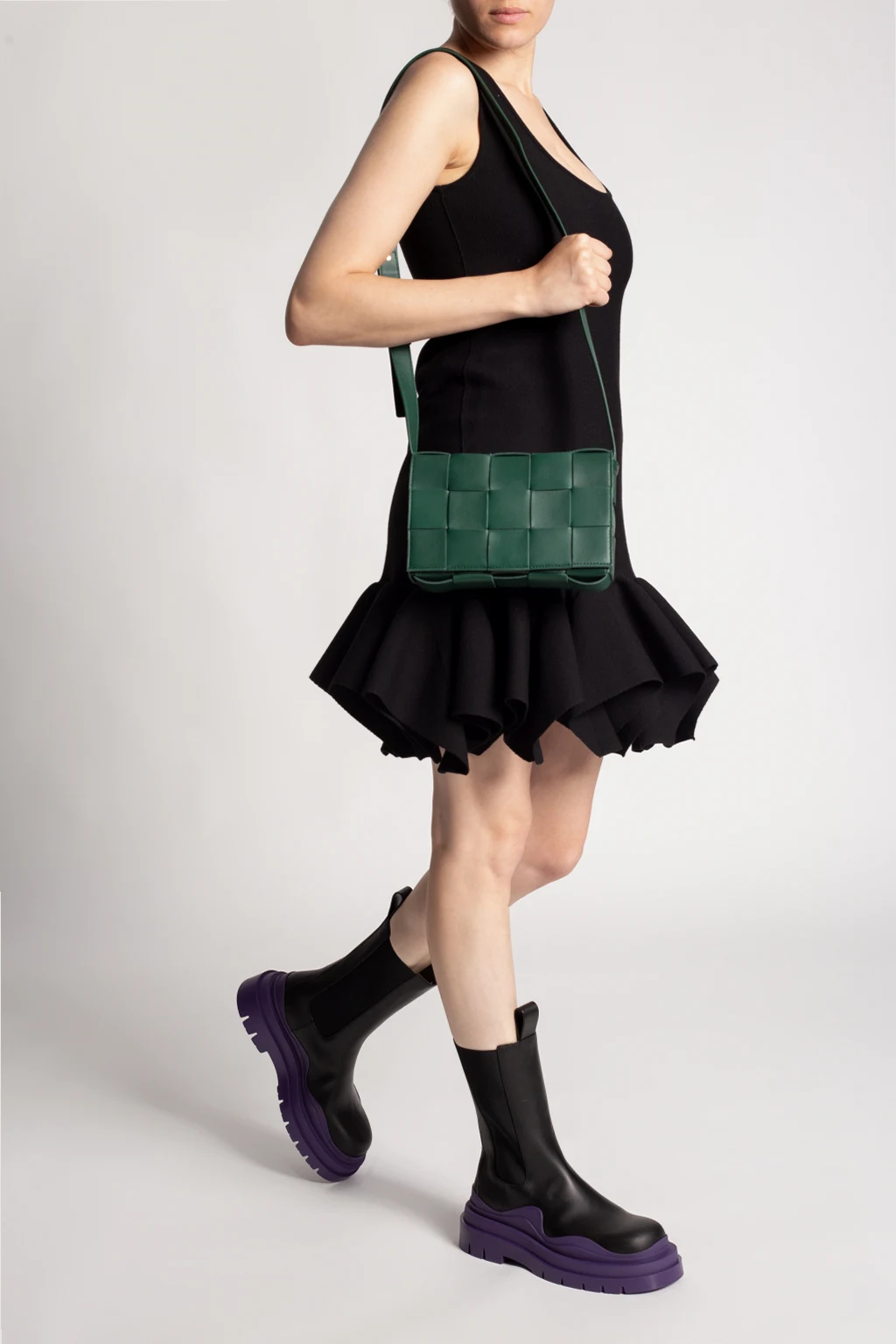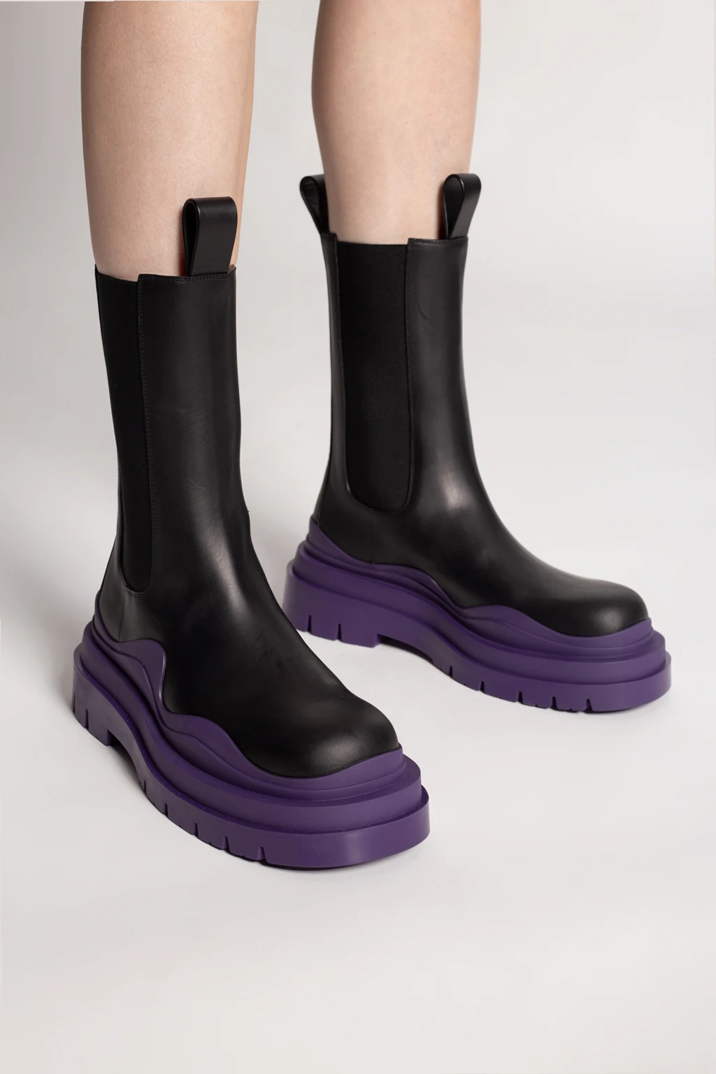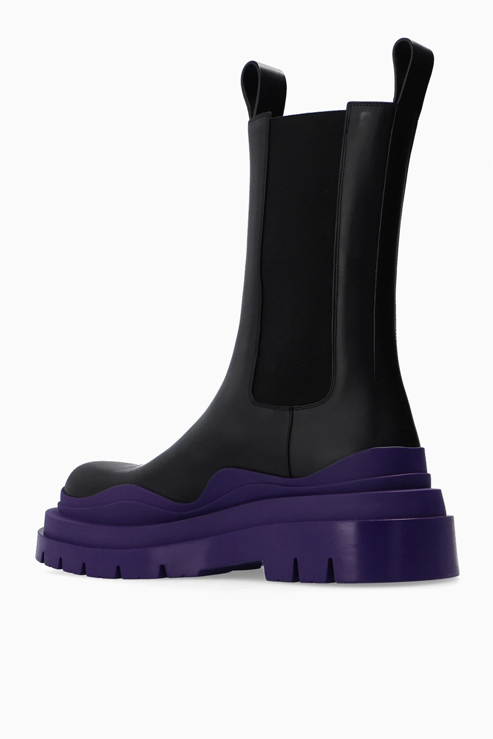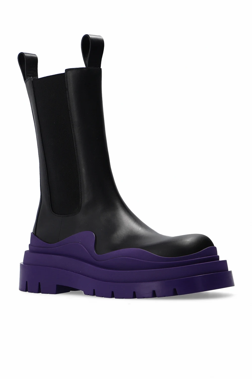 Czarne sztyblety na platformie, model ‘Tire’ Bottega Veneta. Wykonane z cielęcej skóry. Po bokach wszyta taśma elastyczna. Fioletowa, gumowa podeszwa.