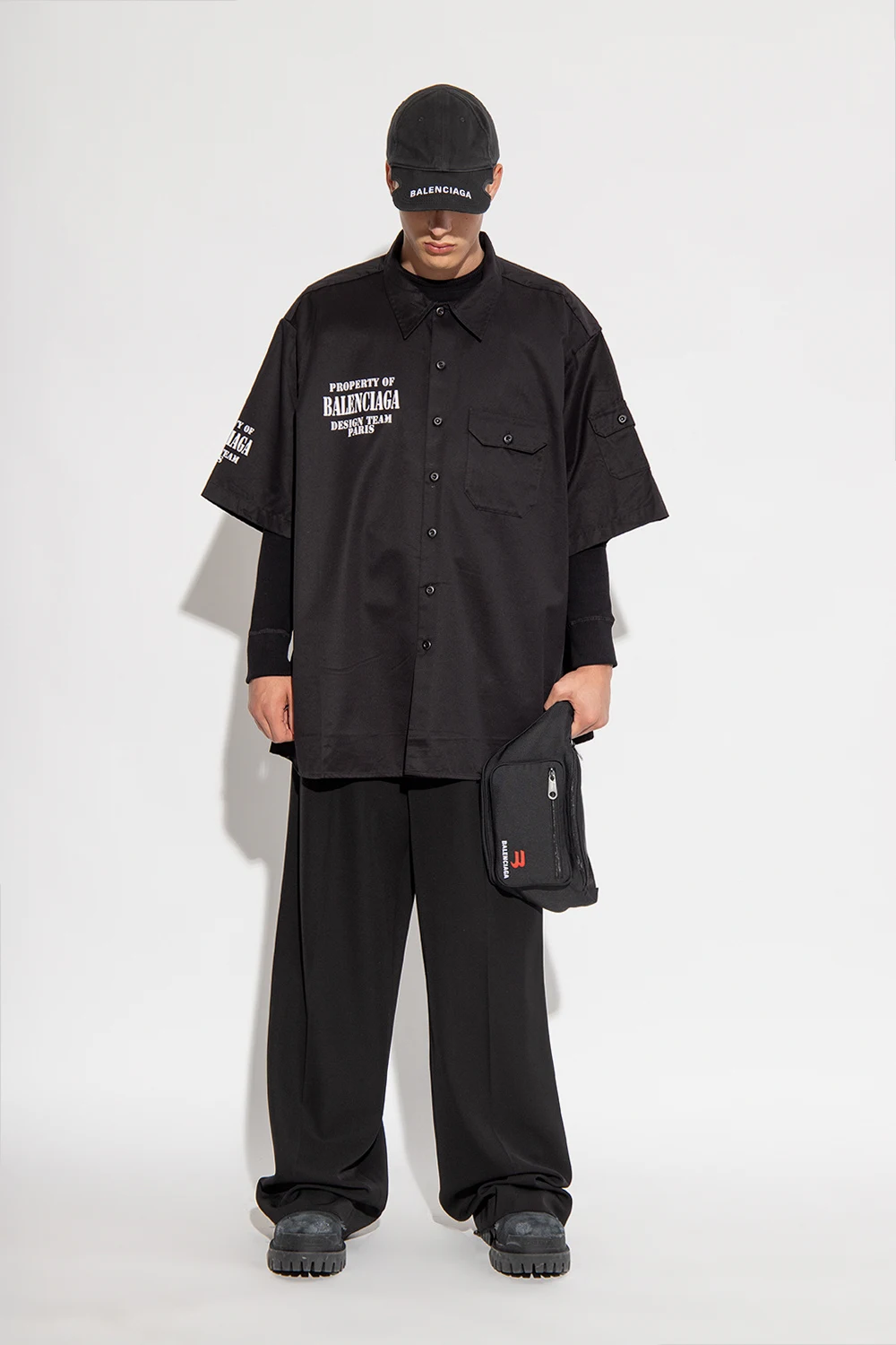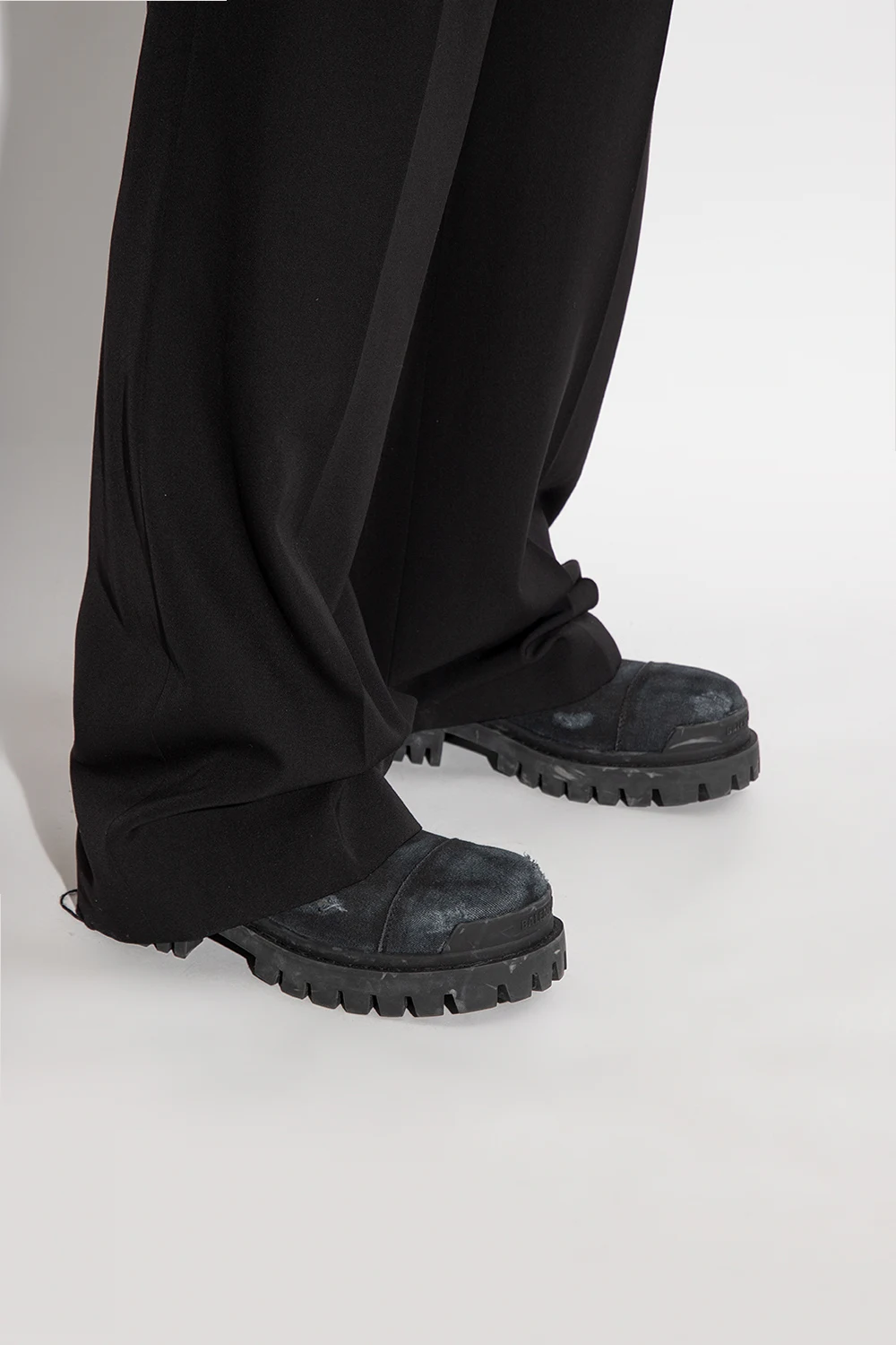 Czarno-granatowe, sznurowane buty, model ‘Strike’ Balenciaga. Wykonane z materiału. Z boku zapinane na zamek. Ozdobione logo. Efekt ‘vintage’. Czarna, gumowa podeszwa.