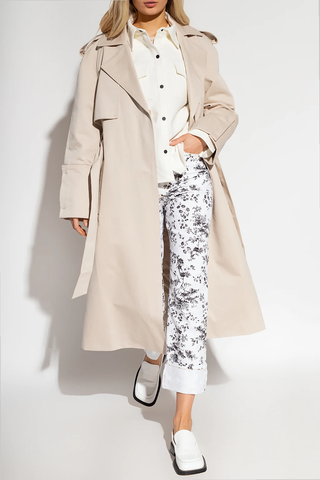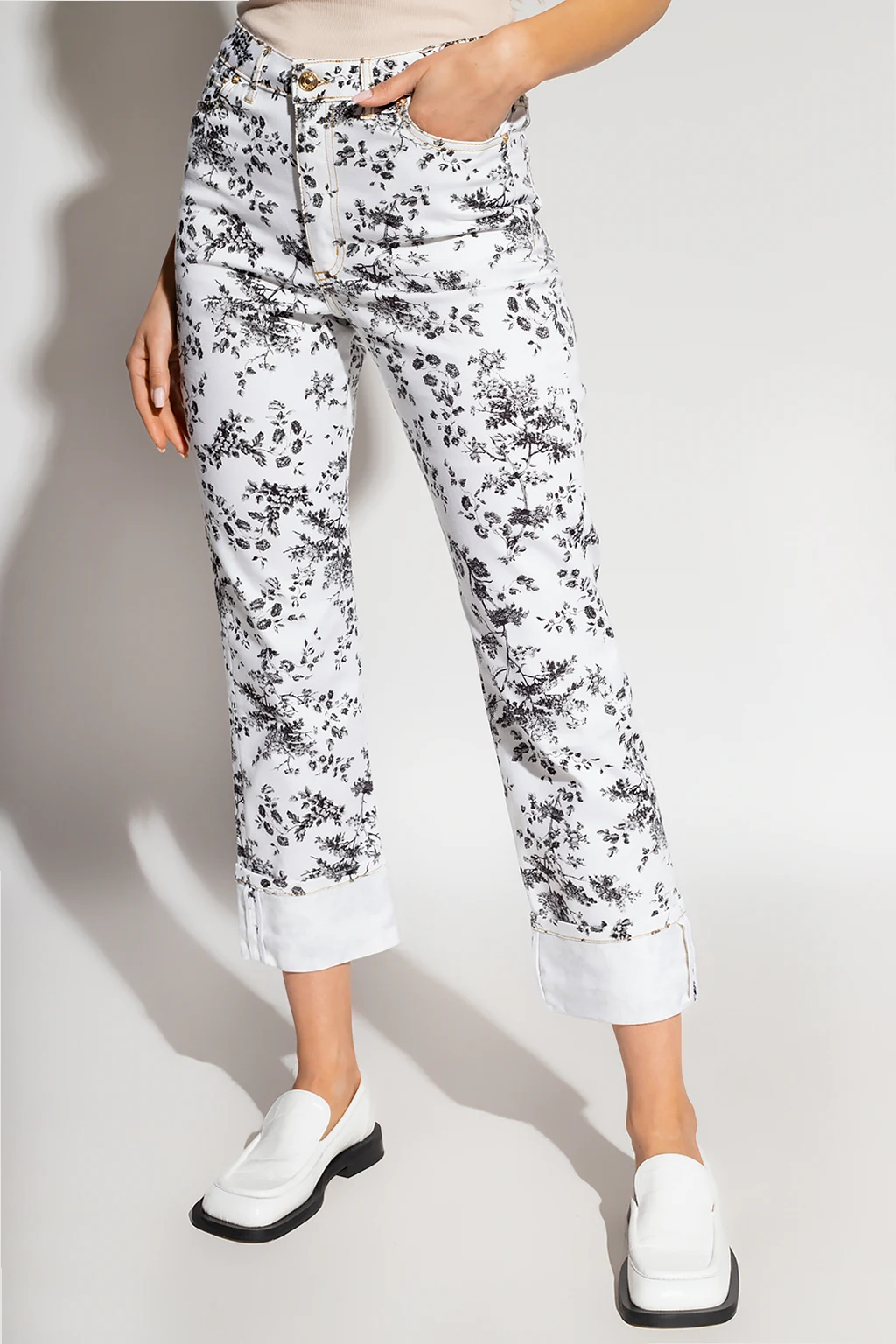 Białe jeansy typu ‘boyfriend’, model ‘Nathaniel’ Erdem. Zapinane na guzik oraz zamek. Pokryte całkowicie szarym nadrukiem z motywem roślinnym ‘Edith Etched Leaves’. Z tyłu biała naszywka z wytłoczonym logo. Pięć wsuwanych kieszeni: trzy z przodu oraz dwie z tyłu. Długie, podwijane nogawki.
