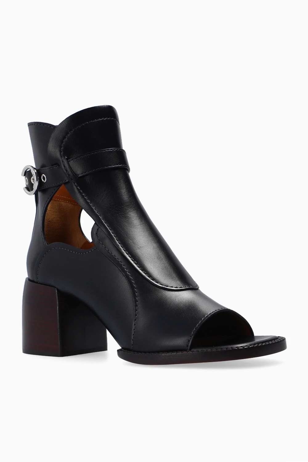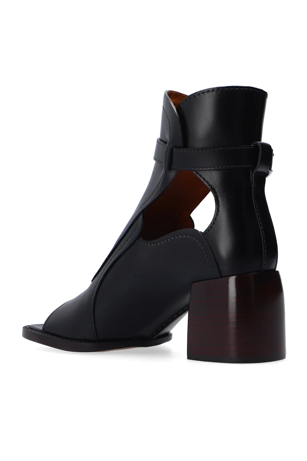 Czarne, skórzane botki na obcasie, model 'Gaile' Chloé. Zapinane na pasek wokół kostki. Odkryte palce. Beżowo-czarna, skórzana podeszwa.