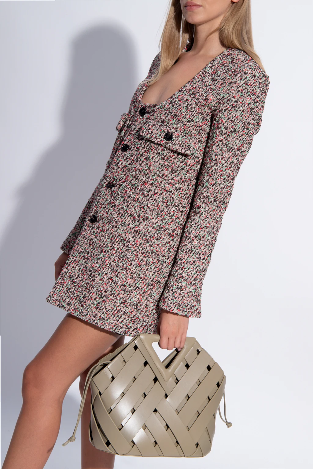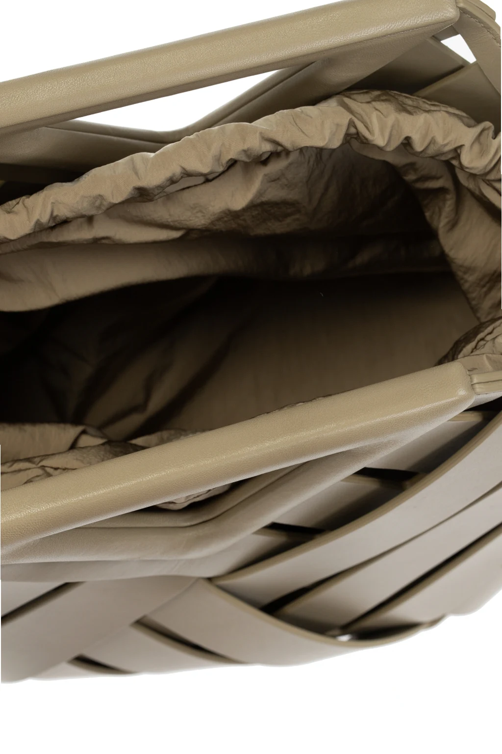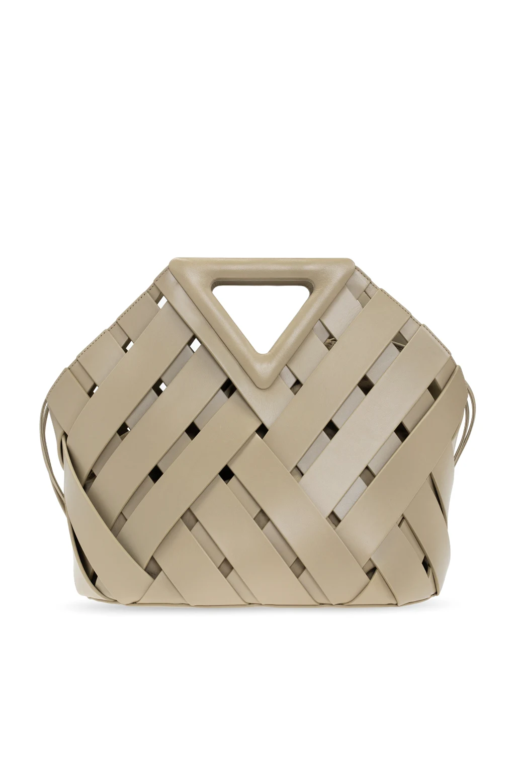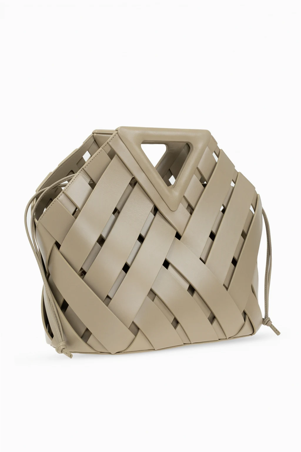 Zielono-szara torba do ręki, model 'Point' Bottega Veneta. Wykonana ze skóry cielęcej oraz jagnięcej. Ściągana trokami. Zapinana na magnetyczny zatrzask z charakterystyczną dla marki trójkątną rączką. Wewnątrz komora.