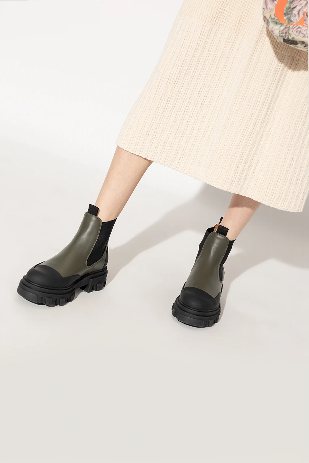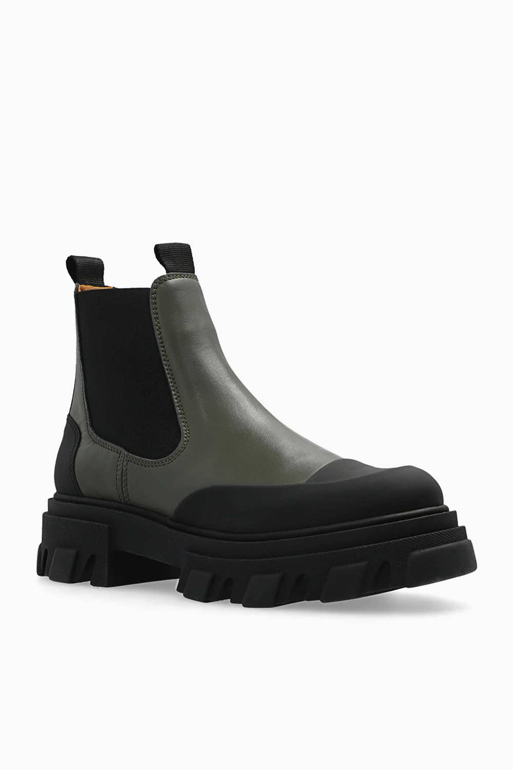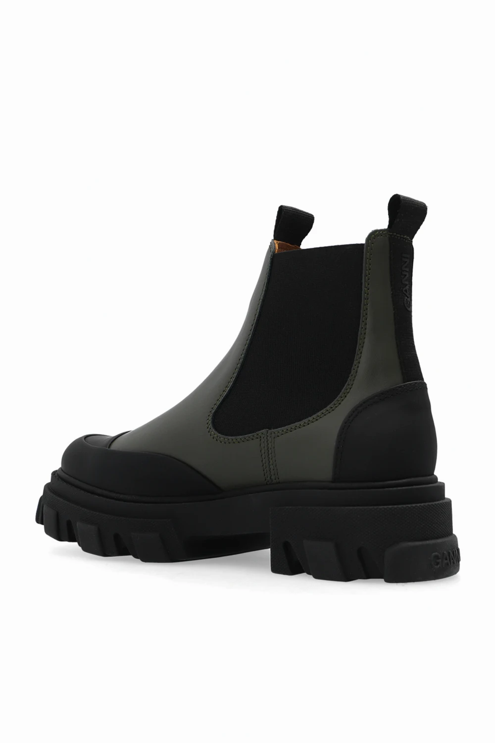 Zielono-czarne sztyblety Ganni. Z tyłu nadruk z logo. Po bokach pas elastyczny. Migdałowy nosek. Czarna, gumowa podeszwa.