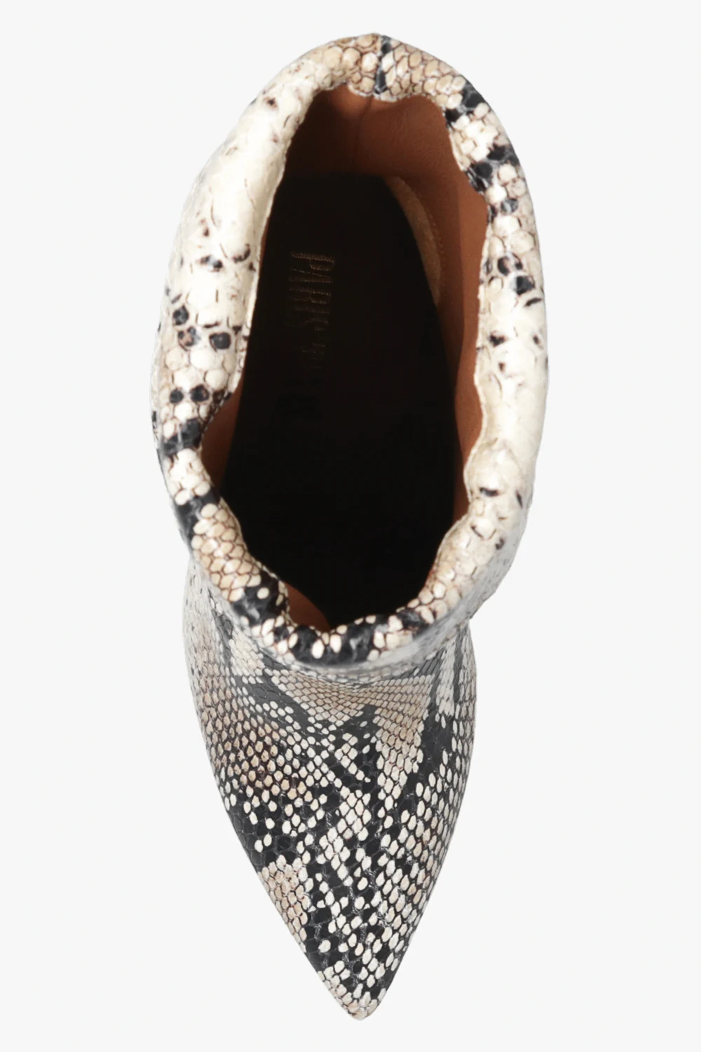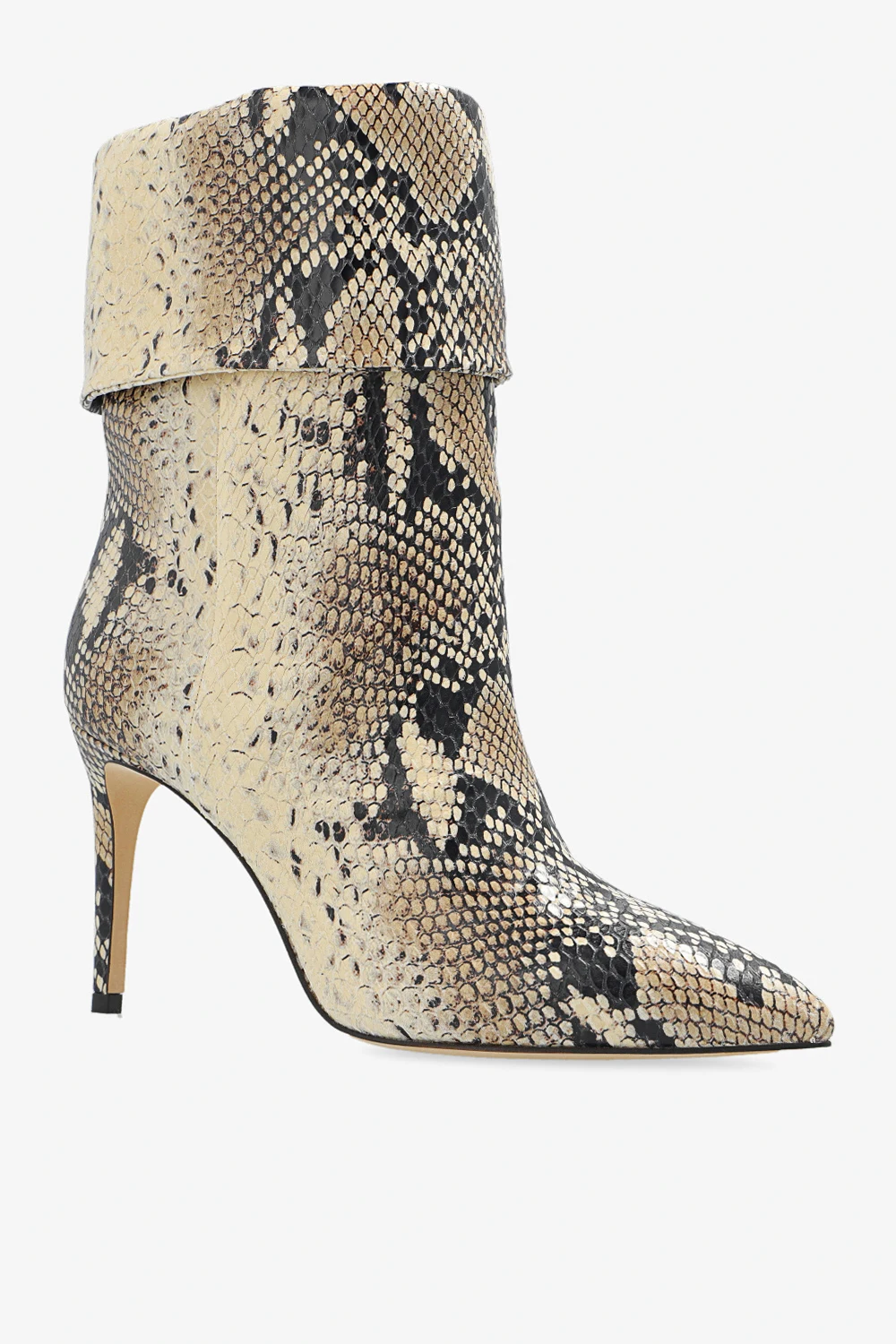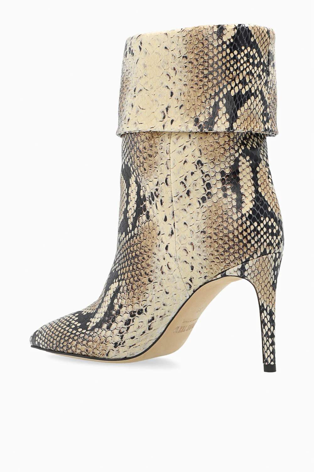 Kremowo-czarne, wsuwane botki na obcasie, model ‘Reverse’ Paris Texas. Wykonane ze skóry imitującej skórę pytona. Nosek w szpic. Jasnobeżowa, skórzana podeszwa.