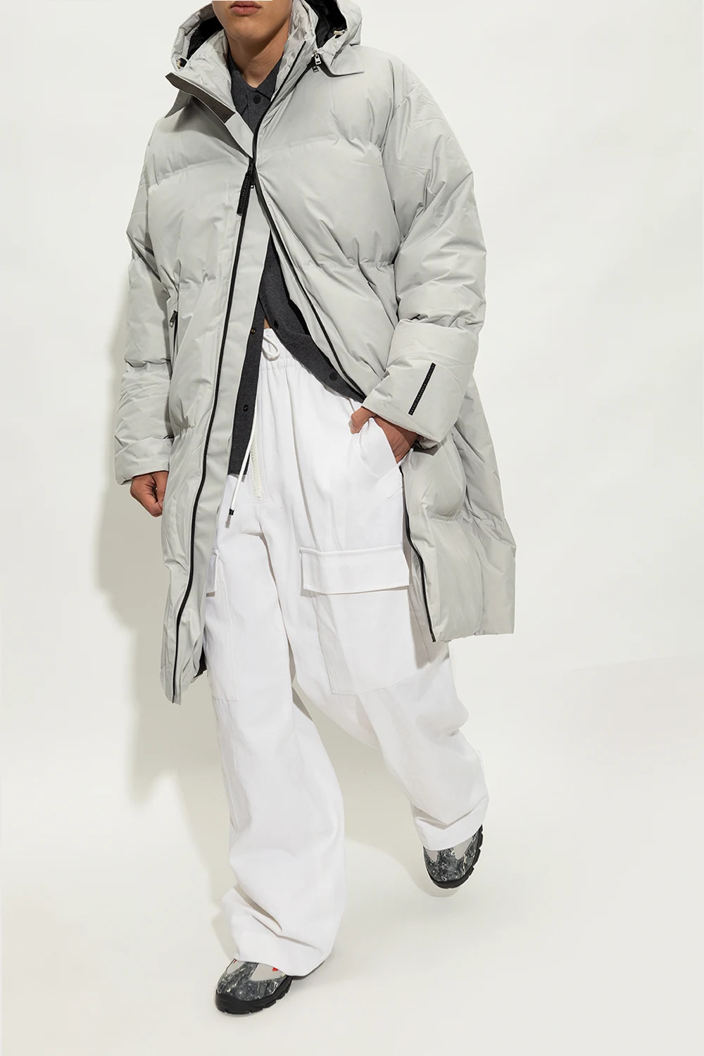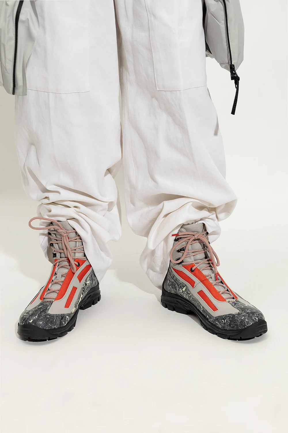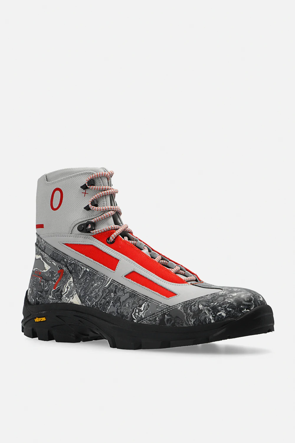 Szaro-pomarańczowo-czarne, sznurowane buty za kostkę A-COLD-WALL*. Wykonane z wytrzymałego płótna pozyskanego z recyklingu, gumowych paneli i skóry. Ozdobione wzorem i nadrukiem z logo. Czarno-żółta, gumowa podeszwa Vibram®.