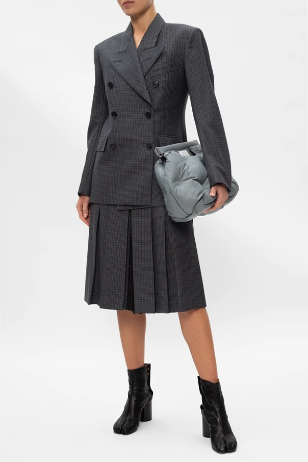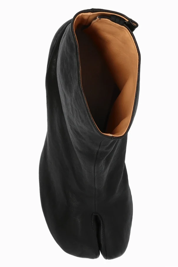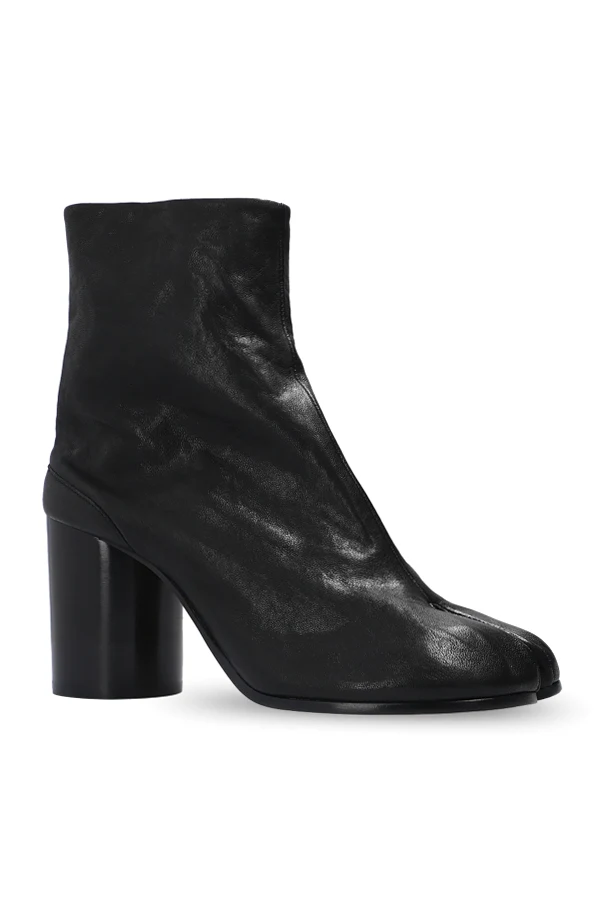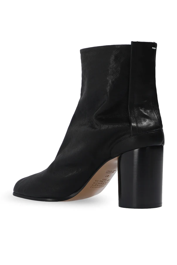 Czarne, skórzane botki na obcasie, model ‘Tabi’ Maison Margiela. Z boku zapinane na haftki. Wycięcie między palcami. Brązowa, skórzana podeszwa.