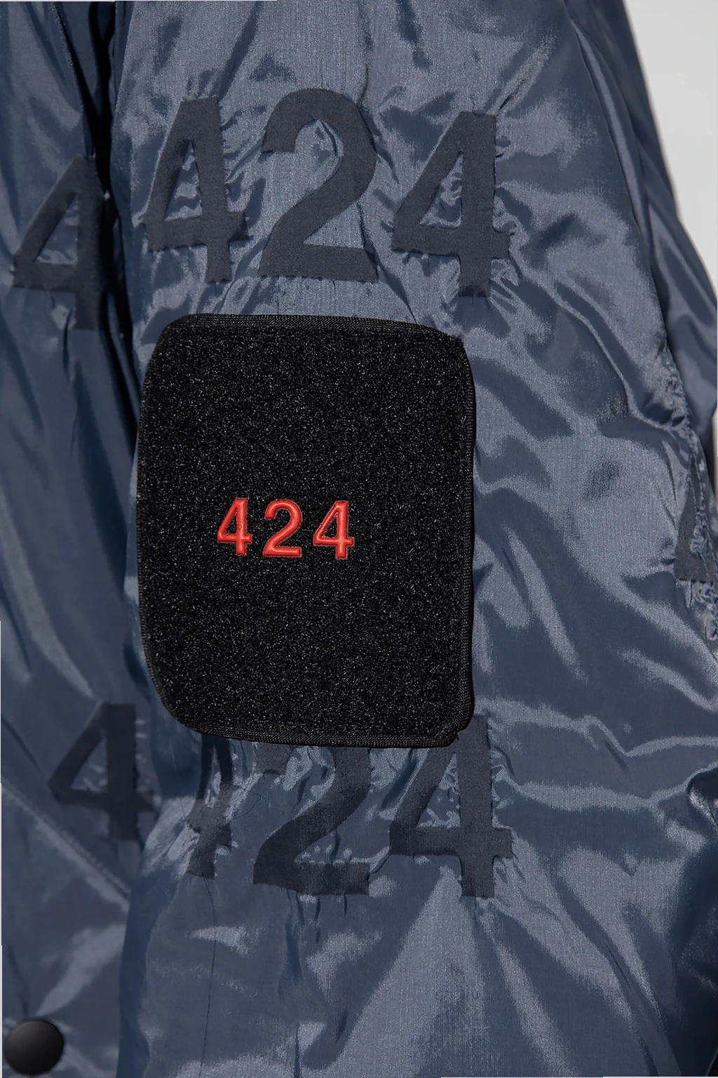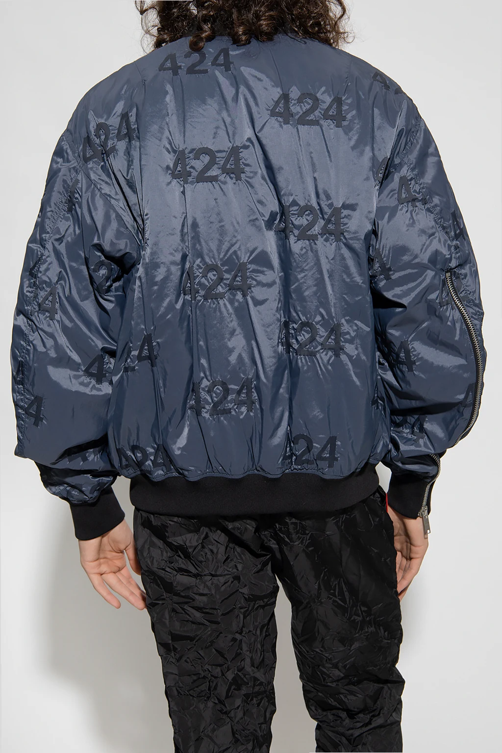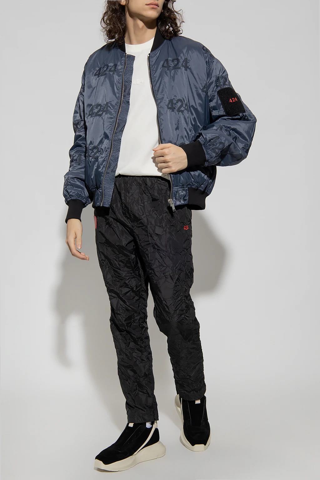 Niebieska kurtka typu ‘bomber’ 424. Zapinana na zamek. Ozdobiona nadrukowanym wzorem z logo. Na rękawie naszywka. Dwie kieszenie z patkami. Stójka, dół i długie rękawy wykończone ściągaczem.