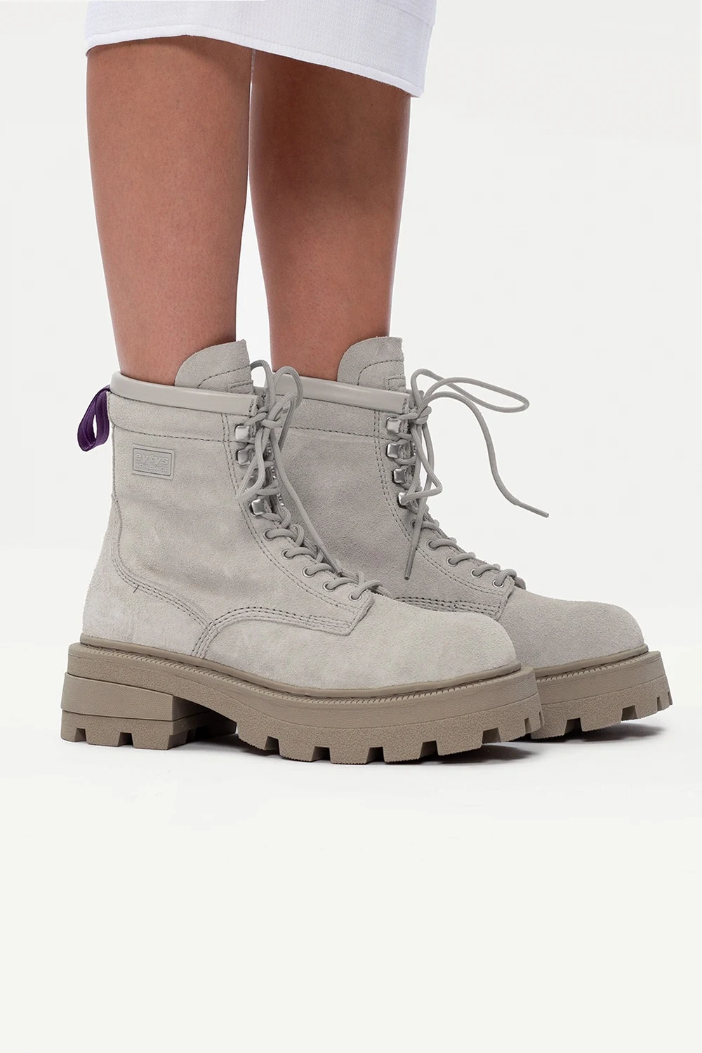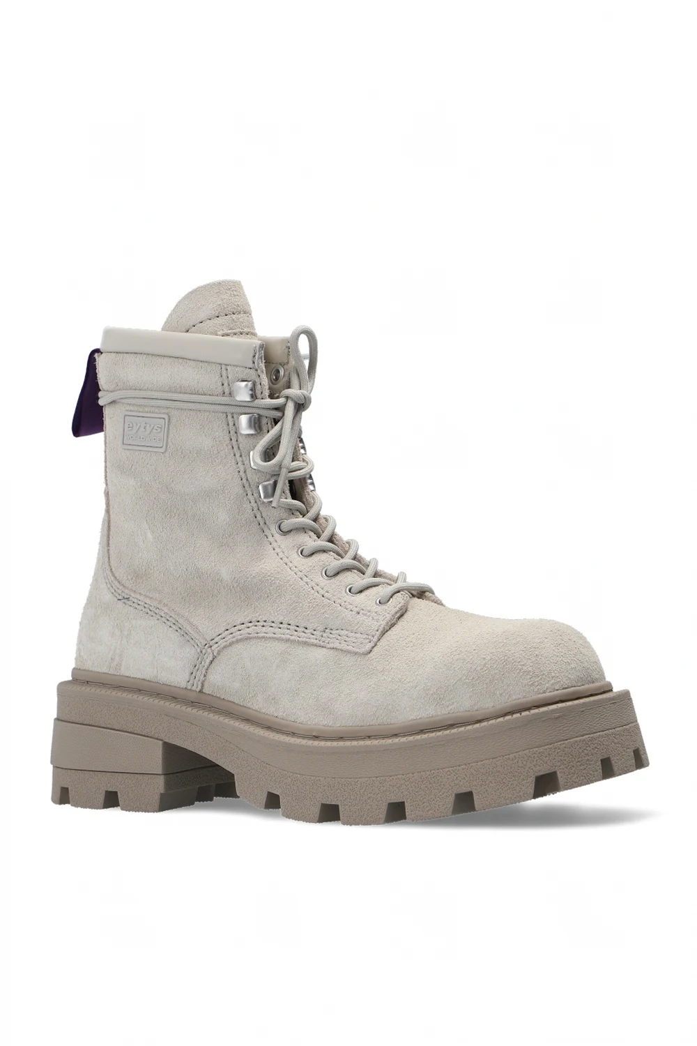 Beżowe, sznurowane trapery na platformie, model ‘Michigan’ Eytys. Wykonane z zamszu. Z tyłu charakterystyczny dla marki rypsowy pasek w kolorze fioletowym. Beżowa, gumowa podeszwa.