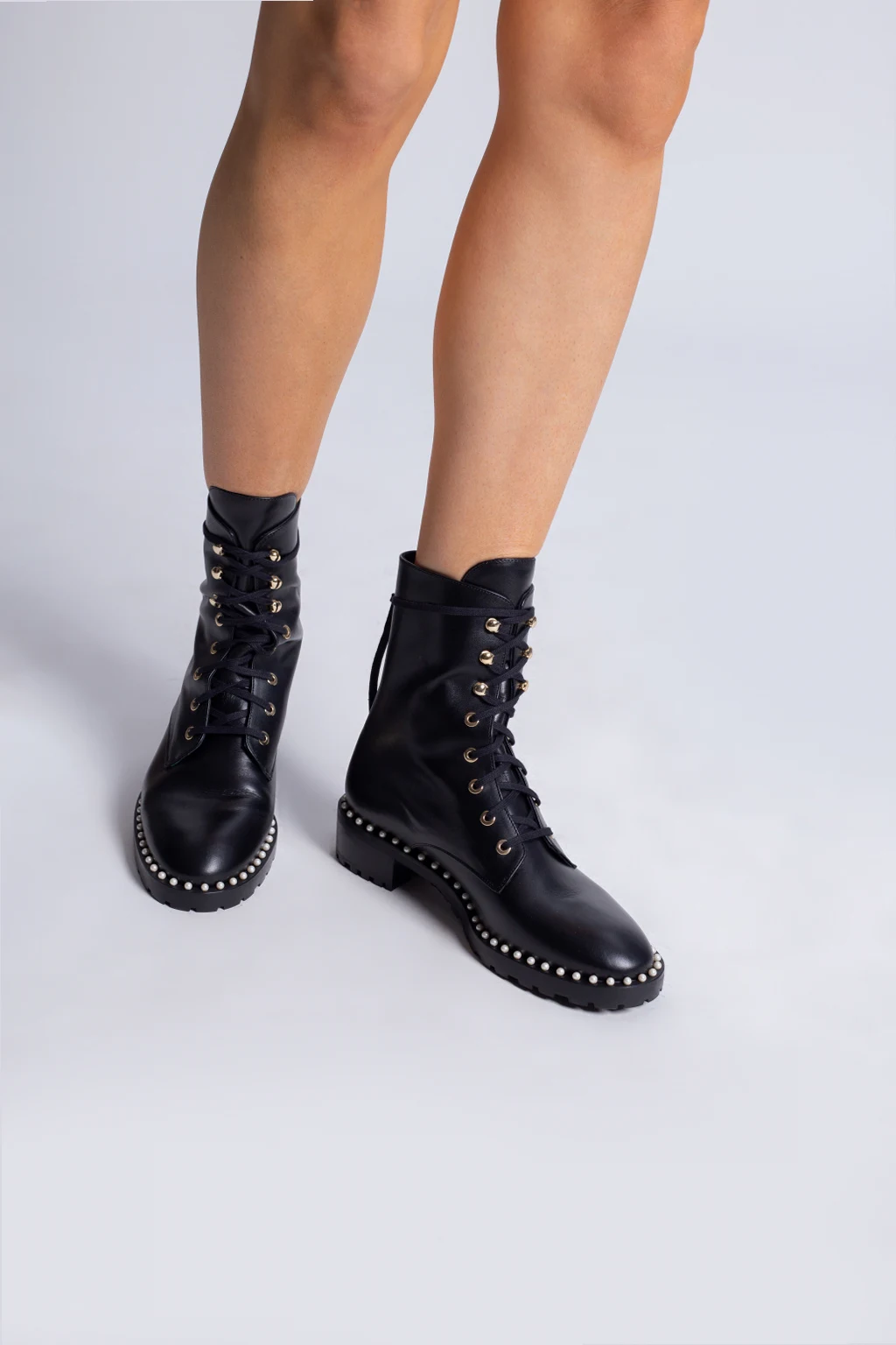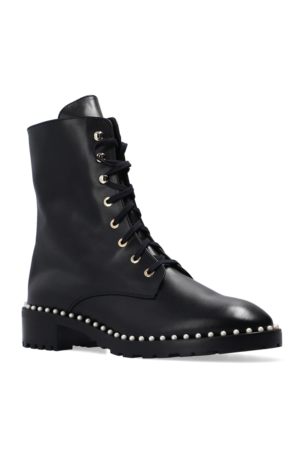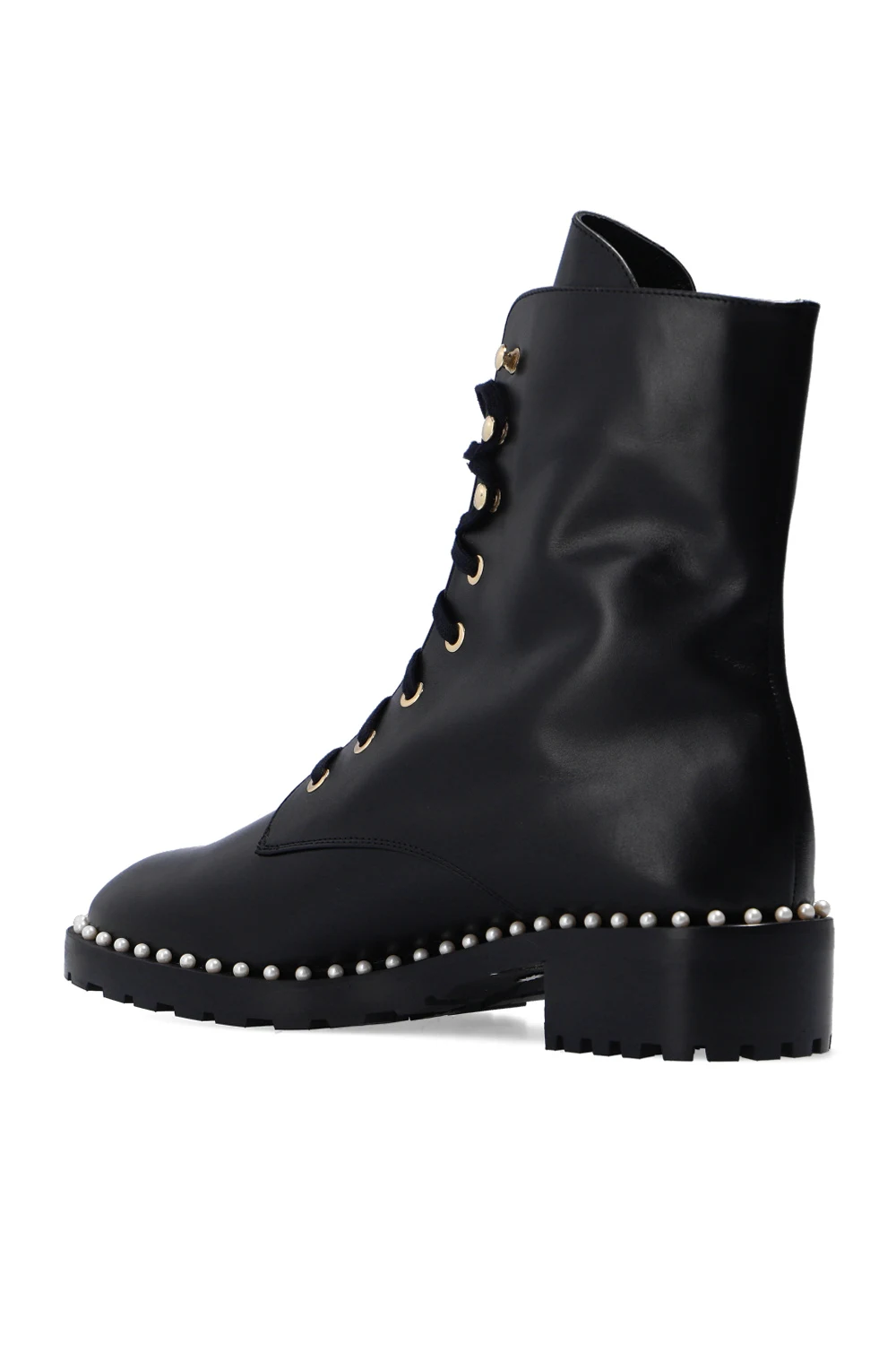 Czarne, sznurowane botki, model ‘Allie’ Stuart Weitzman. Wykonane ze skóry. Wysadzane perłowymi elementami. Czarna, gumowa podeszwa. Metalowe elementy w kolorze złotym.