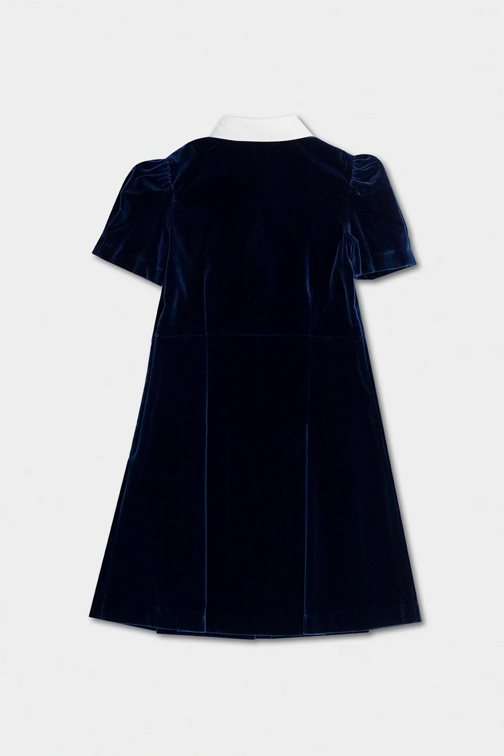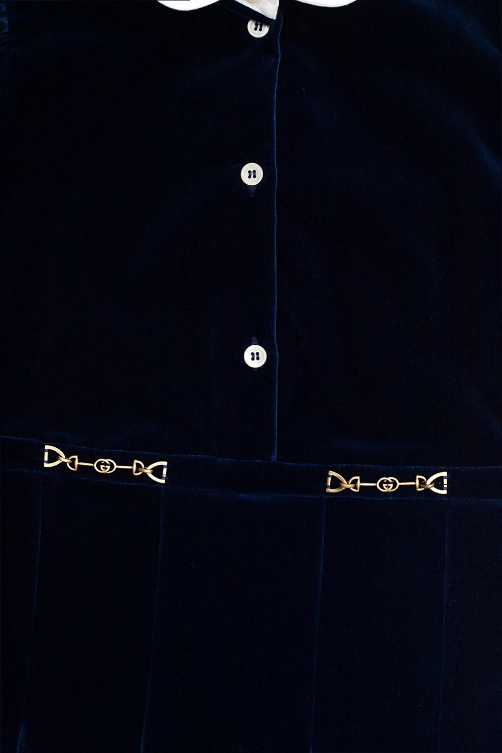 Granatowa sukienka Gucci Kids. Wykonana z bawełny. Zapinana na guziki. Ozdobiona wędzidłem. Krótkie rękawy.