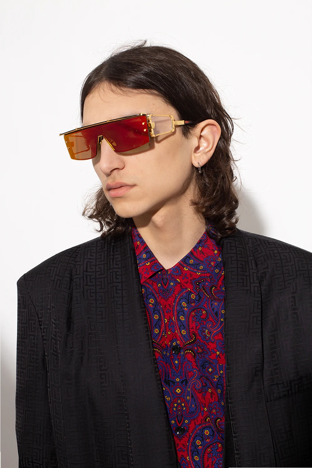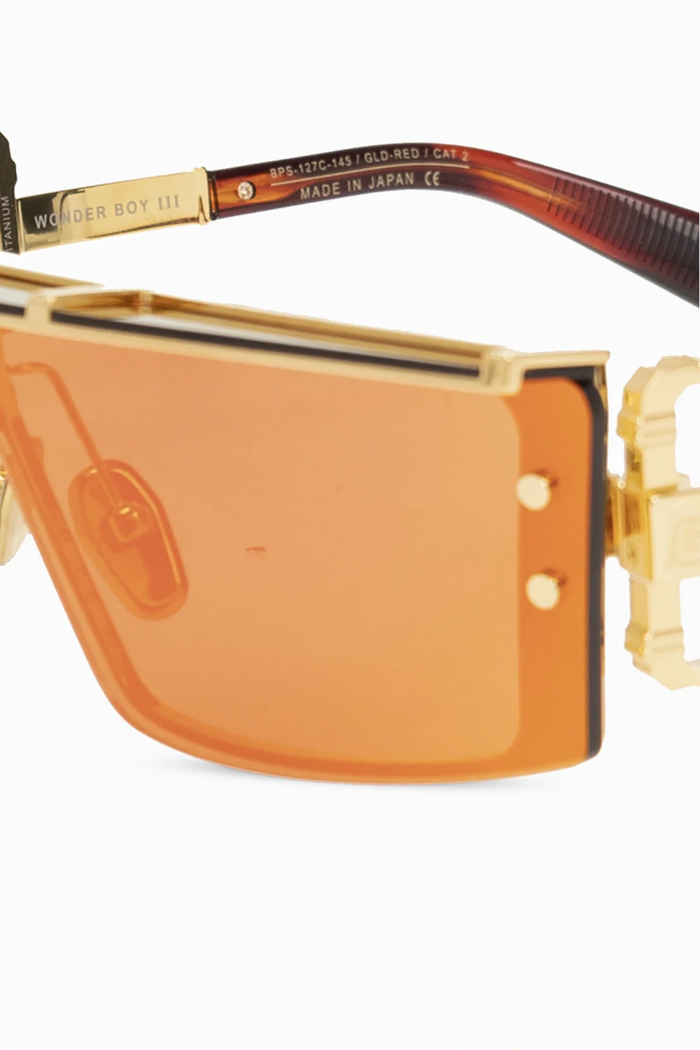 Okulary przeciwsłoneczne w kolorze złoto-brązowym, model ‘Wonder Boy III’ Balmain. Wykonane z tytanu. Zauszniki z transparentną wstawką wykończoną wzorem z monogramem. Pomarańczowoczerwone szkła z efektem lustrzanym, 100% ochroną UV i powłoką antyrefleksyjną. Dołączone etui.