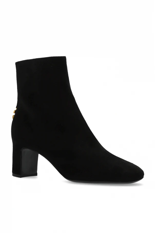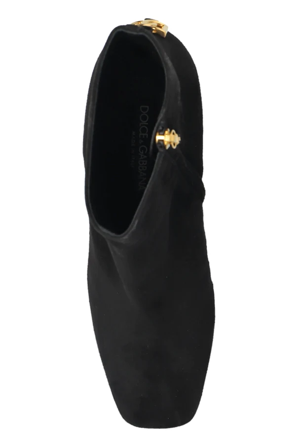 Zamszowe botki marki Dolce & Gabbana olśniewają ponadczasową elegancją i wyrafinowanym kunsztem wykonania. Delikatny, czarny zamsz o jednolitej, matowej strukturze subtelnie otula kostkę, tworząc smukły, dopasowany fason z lekko zwężanym noskiem. Stabilny obcas w formie klasycznego słupka zapewnia wyjątkowy komfort codziennego użytkowania, nie rezygnując przy tym ze stylu.