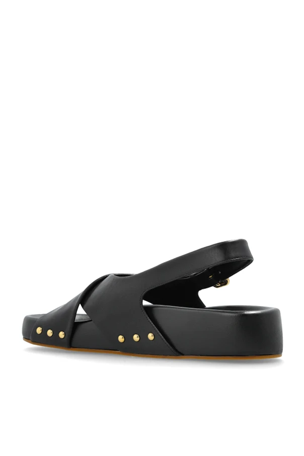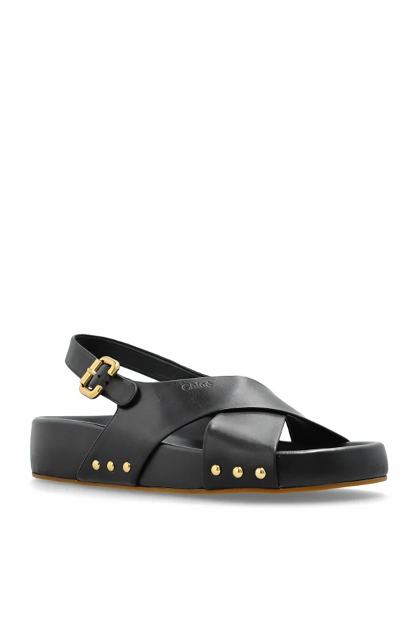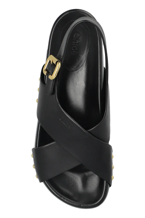 Skórzane sandały domu mody Chloé to kwintesencja wyrafinowania, której siłą jest szlachetna prostota oraz przemyślane detale. Dominująca czerń gładkiej skóry jagnięcej subtelnie kontrastuje ze złocistymi, geometrycznymi elementami – sprzączką i symetrycznymi nitami rozmieszczonymi z boku podeszwy, nadając całości nutę luksusu. Szerokie paski krzyżujące się na podbiciu oraz stabilizujący, regulowany tylny pasek nie tylko gwarantują niebywałą wygodę, lecz również podkreślają ponadczasowy charakter sandałów.