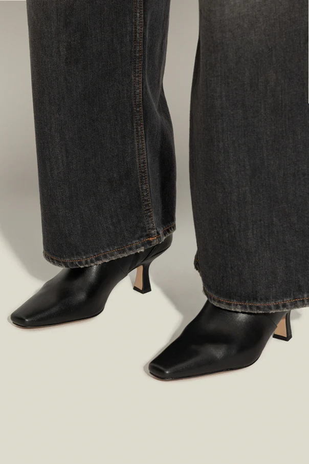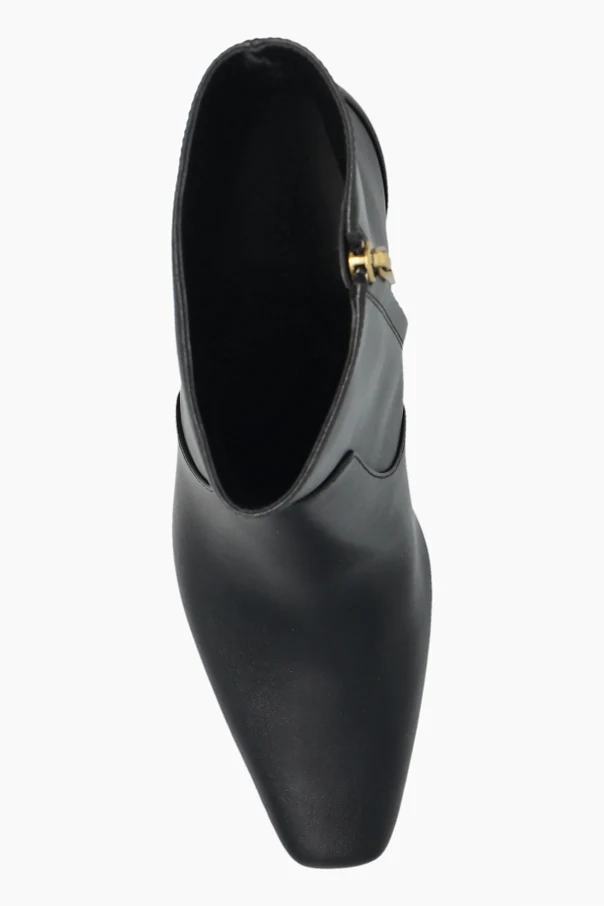 Obuwie wykonano z wysokogatunkowej, matowej skóry licowej w głębokiej czerni, co gwarantuje niepowtarzalny luksus i szlachetność. Uwagę zwraca średniej wysokości rzeźbiony obcas typu kaczuszka, którego charakterystyczna linia podkreśla unikatowy styl. Subtelne, złote logo na pięcie oraz praktyczny zamek błyskawiczny czynią z tych botków idealną syntezę funkcji i dopracowanego detalu.
