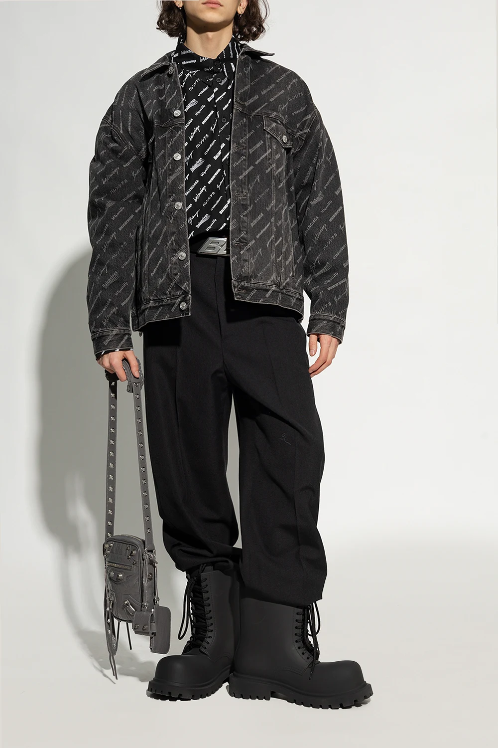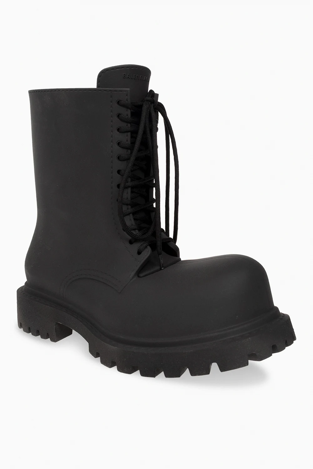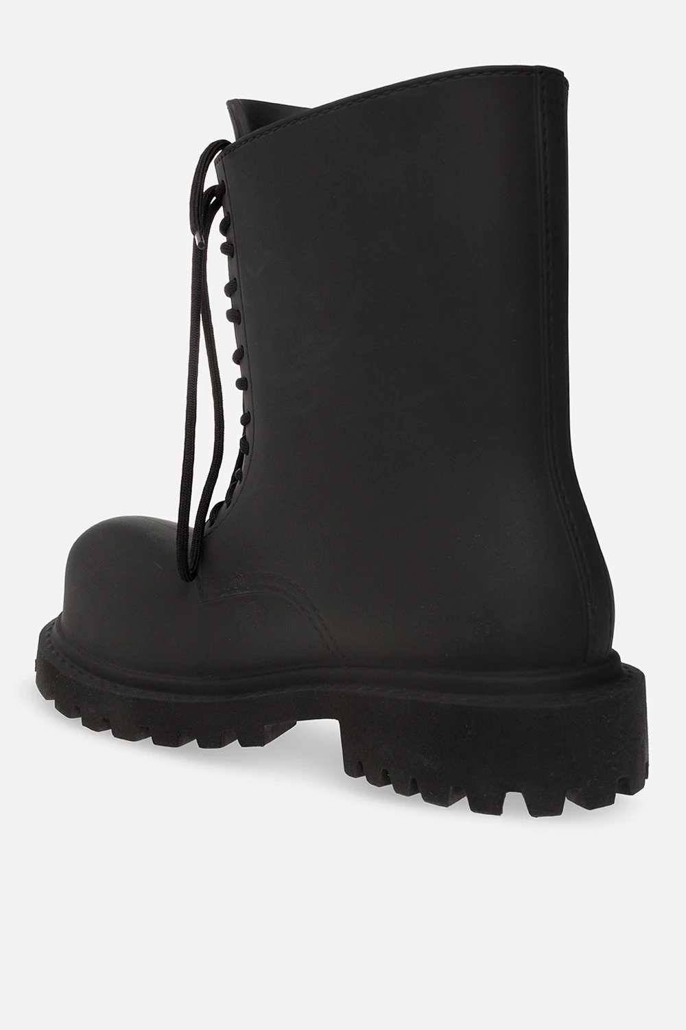 Czarne, sznurowane buty za kostkę, model ‘Steroid’ Balenciaga. Wykonane z gumy. Ozdobione wzorem z logo. Czarna, gumowa podeszwa.