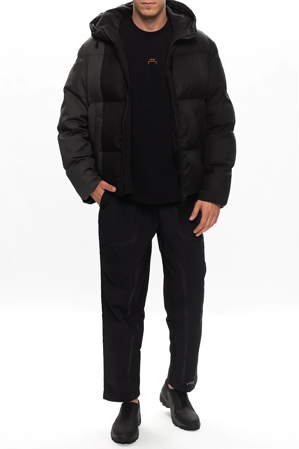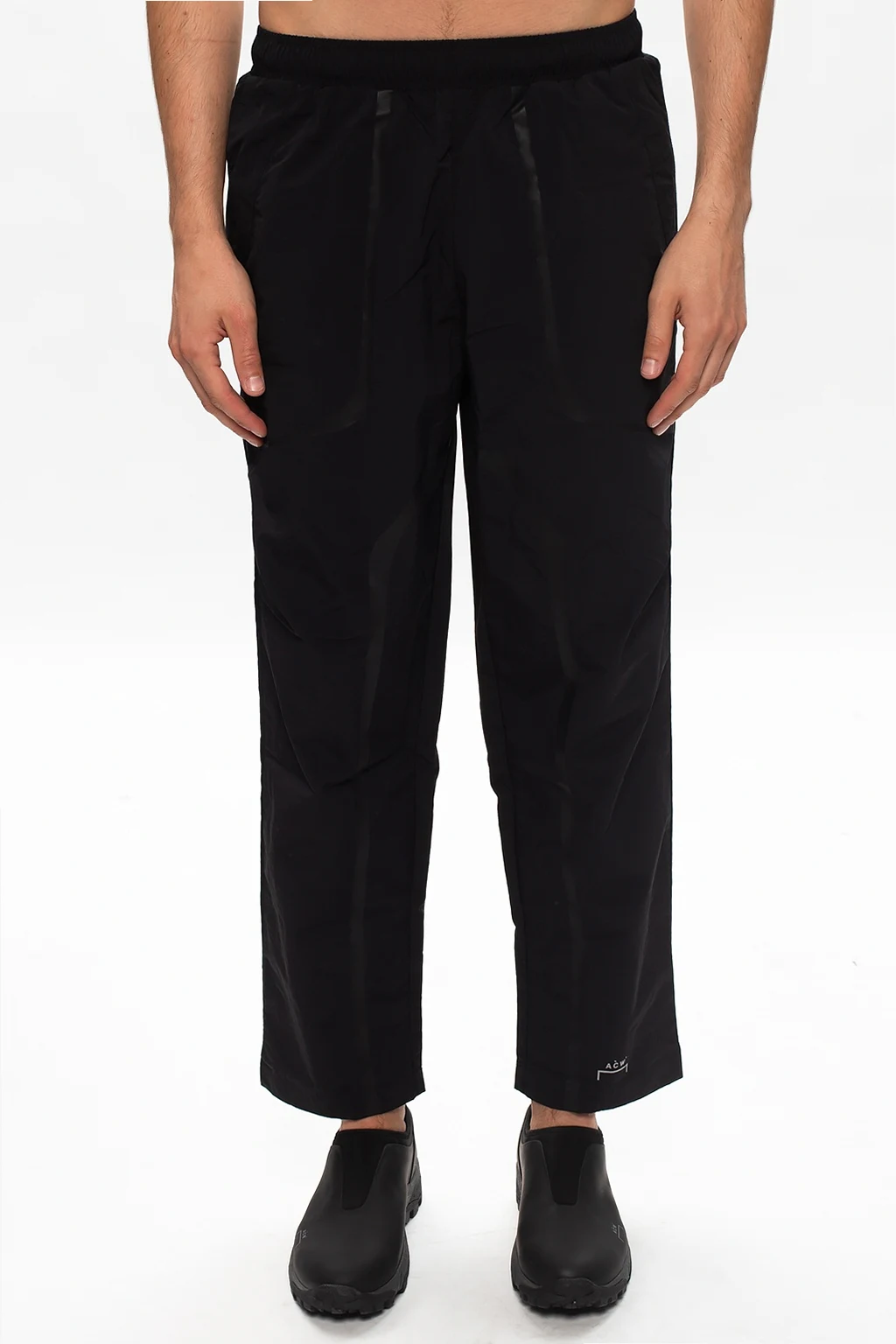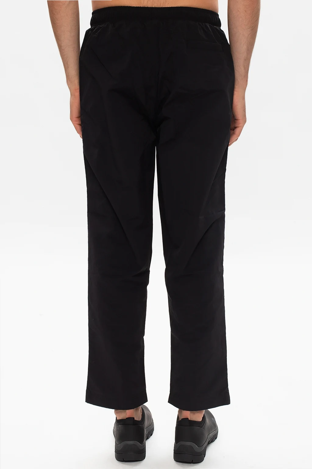 Czarne, ortalionowe spodnie A Cold Wall. W pasie ściągane trokami. Ozdobione czarnym nadrukiem. Z przodu dwie kieszenie. Z tyłu kieszeń.