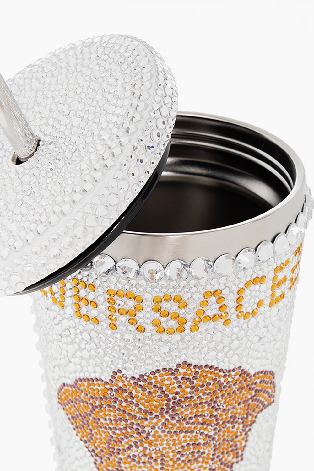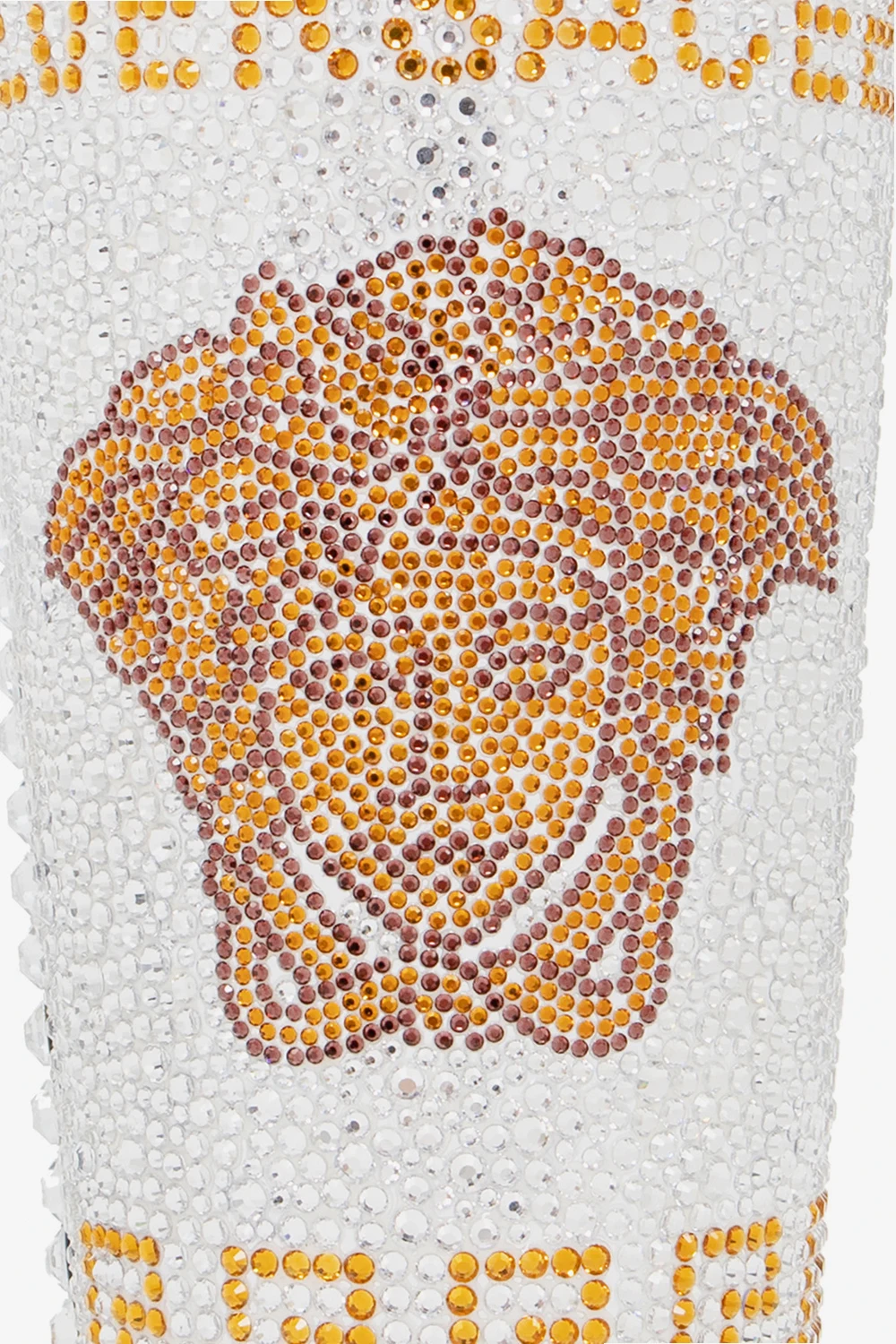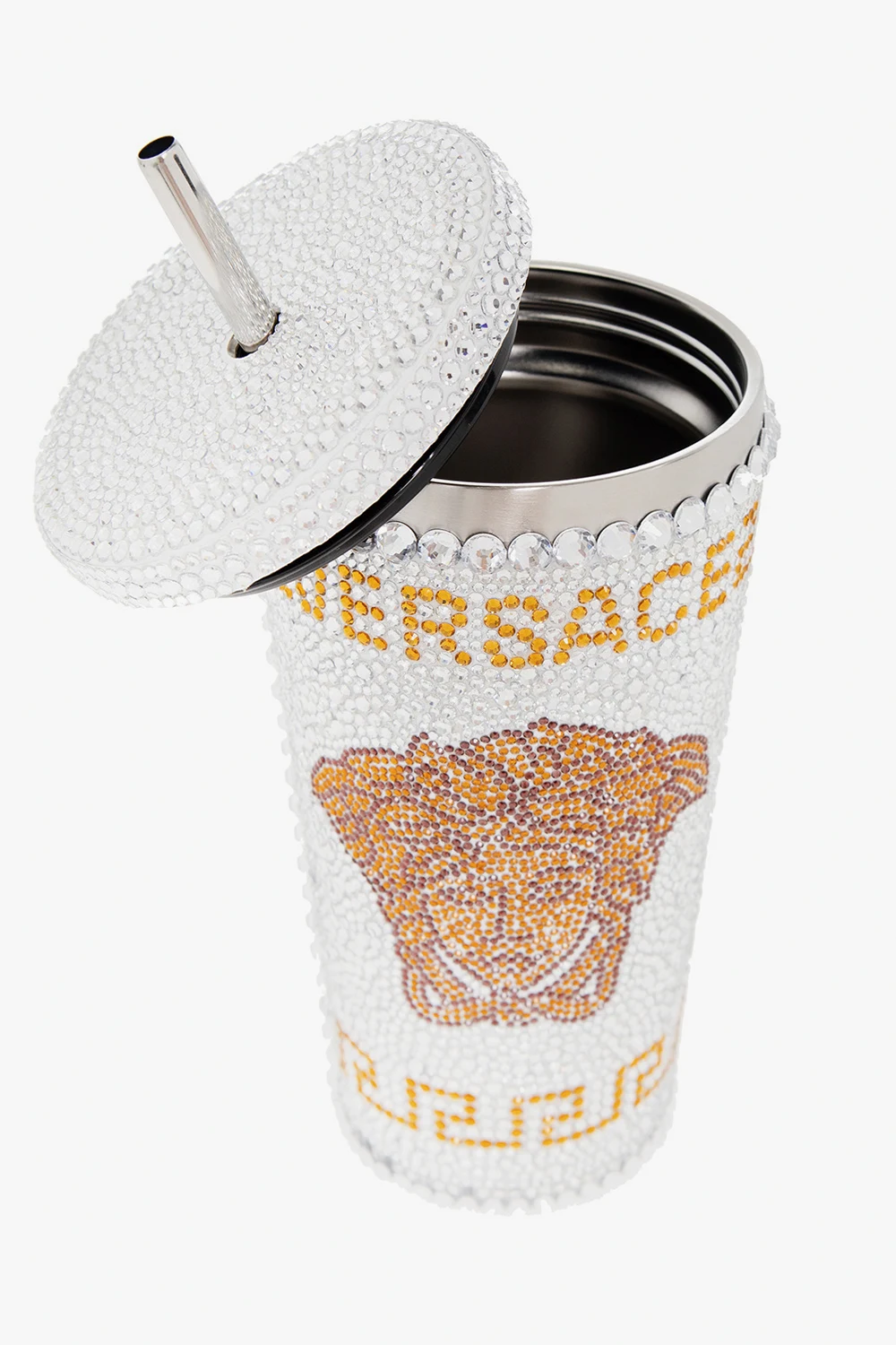 Kubek podróżny w kolorze srebrno-złotym Versace Home. Wykonany z aluminium. Całkowicie pokryty kryształkami, ozdobiony jest charakterystycznym dla marki motywem głowy Meduzy, logo oraz wzorem ’Greca’, co sprawia, że całość jest idealnym ucieleśnieniem stylu glamour. Dołączona metalowa słomka w kolorze srebrnym.