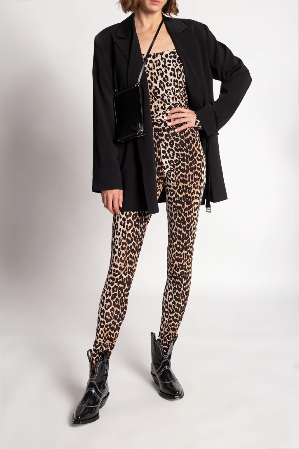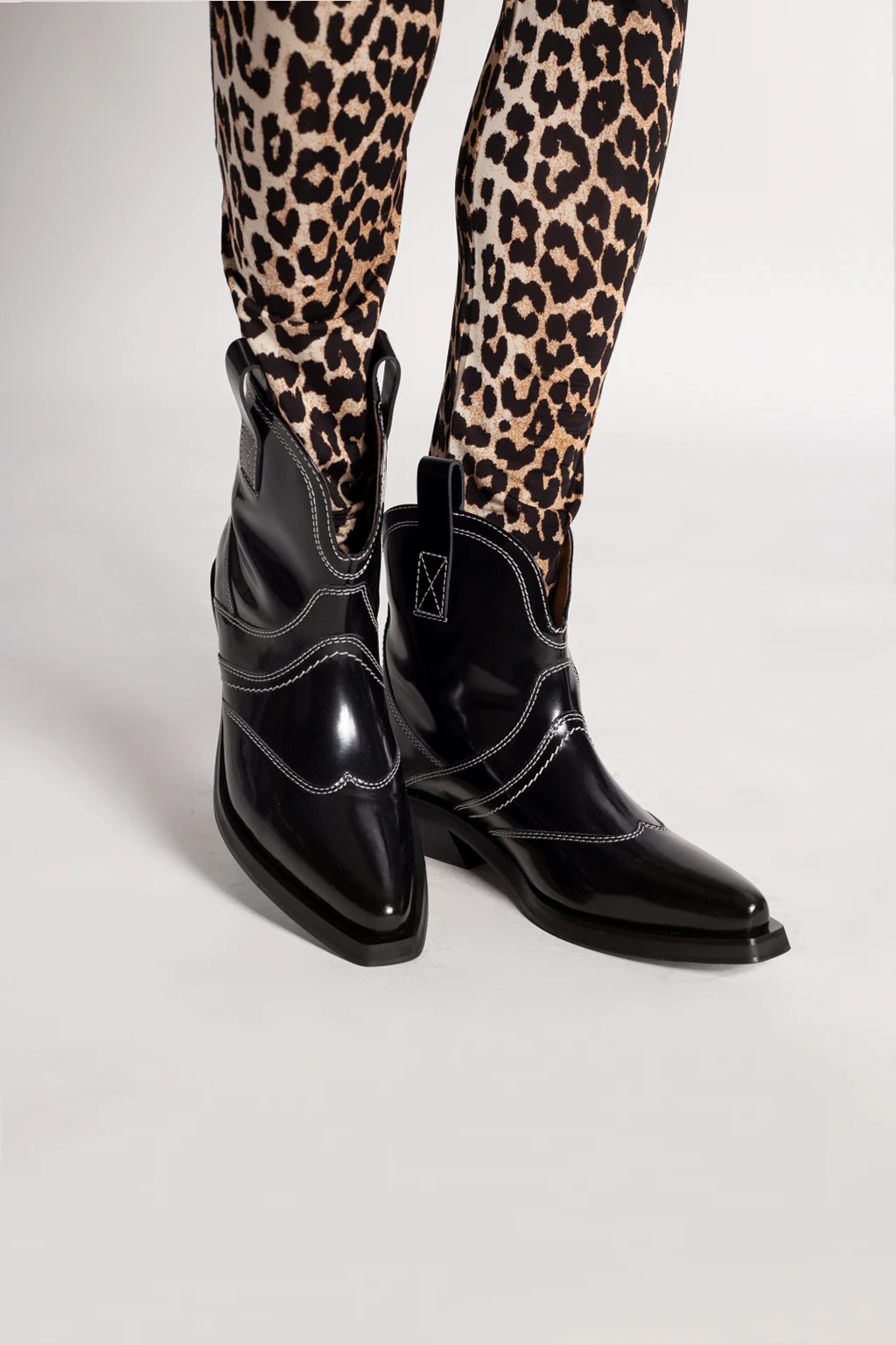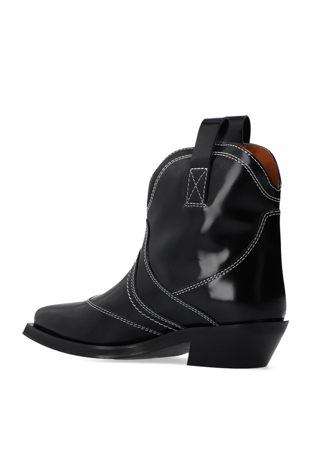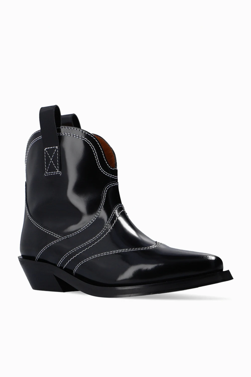 Czarne, krótkie kowbojki Ganni. Wykonane z lakierowanej skóry. Dekoracyjne przeszycia w kolorze białym. Czarna, gumowa podeszwa.