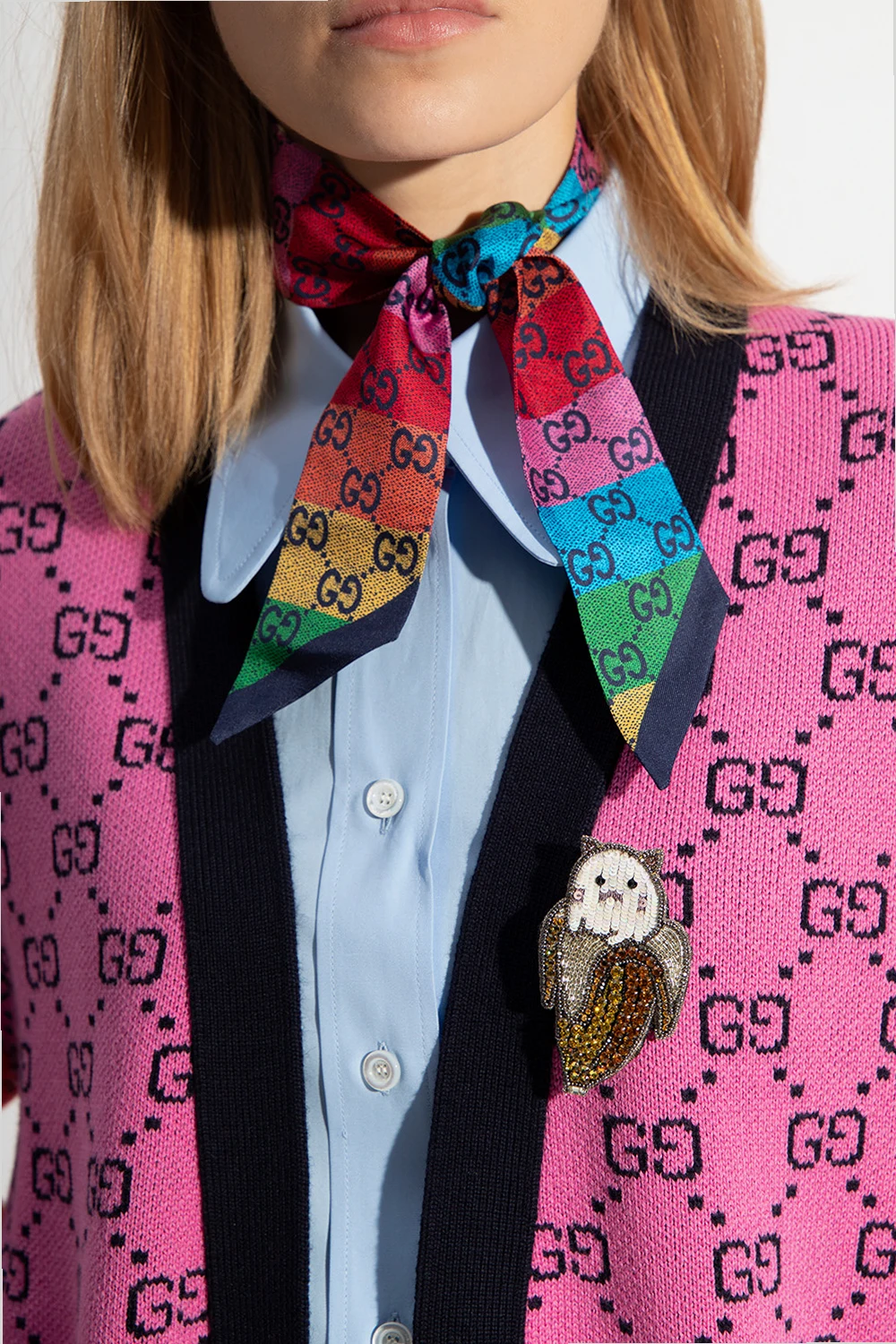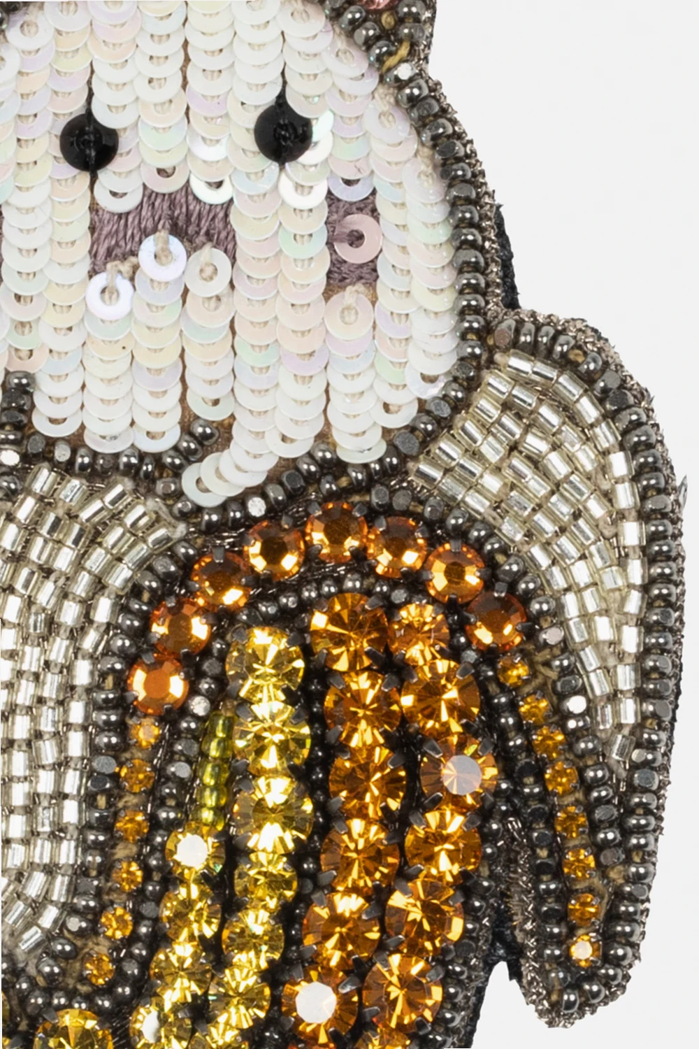 Kolorowa broszka Gucci. Wykończona kolorowymi cekinami i kryształami.
