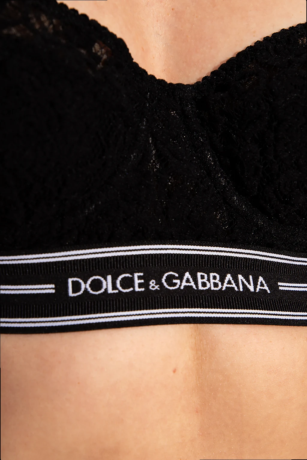 Czarny, koronkowy biustonosz Dolce & Gabbana. Zapinany na haftki. Cienkie, regulowane ramiączka. Na dole wszyta guma z logo w kolorze białym.
