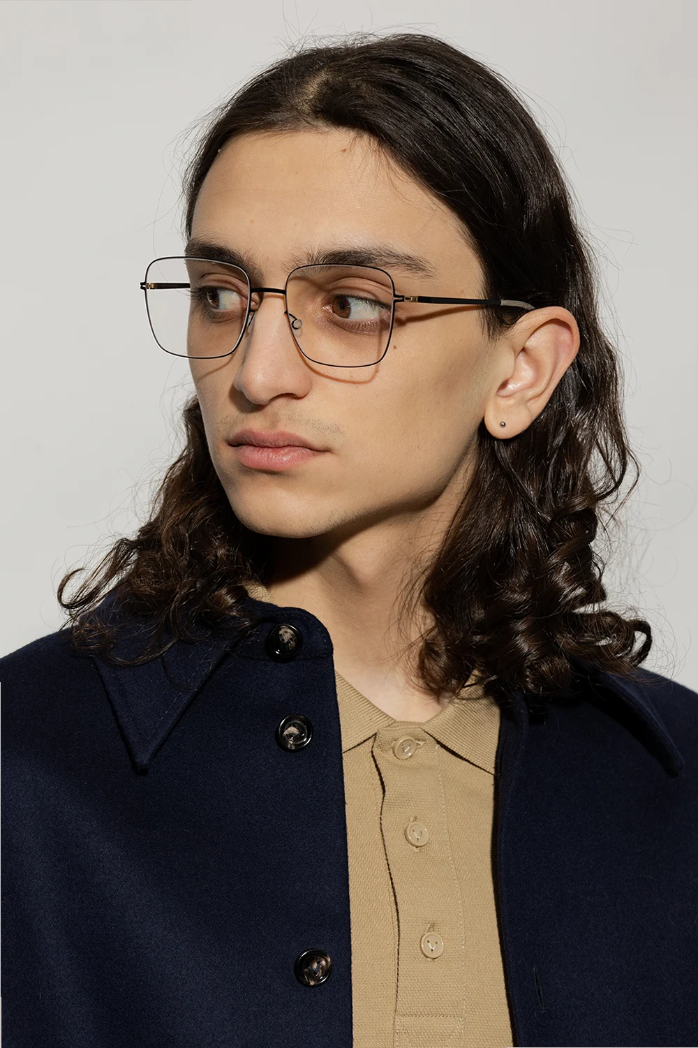 Okulary korekcyjne w kolorze czarno-złotym, model ‘Sila’ Mykita. Wykonane ze stali nierdzewnej. Ozdobione wygrawerowanym wzorem. Transparentne zauszniki.