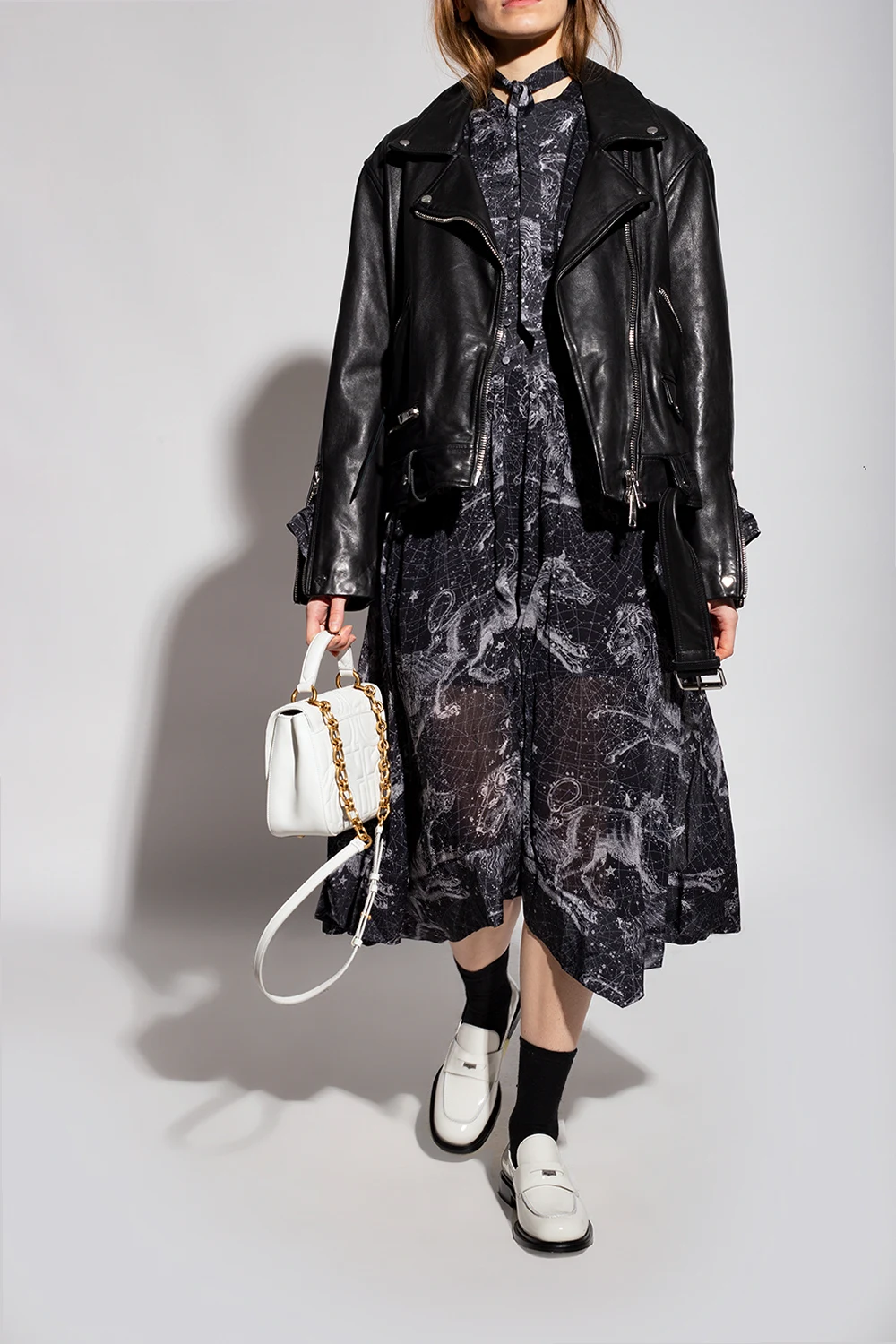 – Czarne loafersy z kwadratowymi noskami i frędzlami