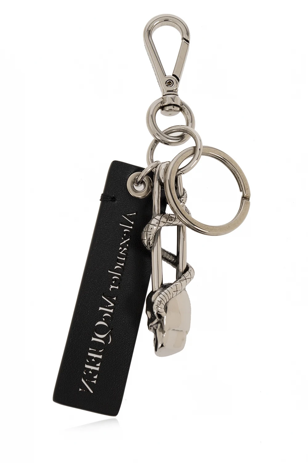 Brelok w kolorze srebrnym Alexander McQueen. Ozdobiony czarną, skórzaną zawieszką z logo. Druga zawieszka w kształcie agrafki, ozdobiona aplikacją z motywem charakterystycznej czaszki i węża.