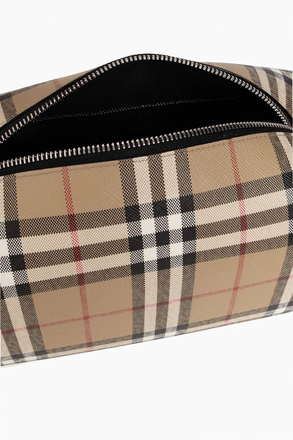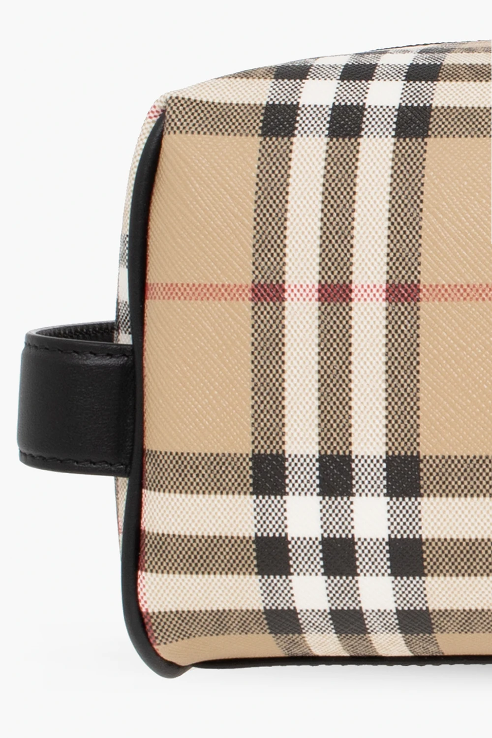 Beżowa kosmetyczka Burberry. Wykonana z powlekanego, bawełnianego płótna oraz wykończona skórą. Zamykana na zamek. Ozdobiona charakterystycznym dla marki wzorem w kolorową kratę. Z boku skórzany uchwyt. Wewnątrz komora z trzema kieszeniami: dwiema wsuwanymi oraz zamykaną na zamek.
