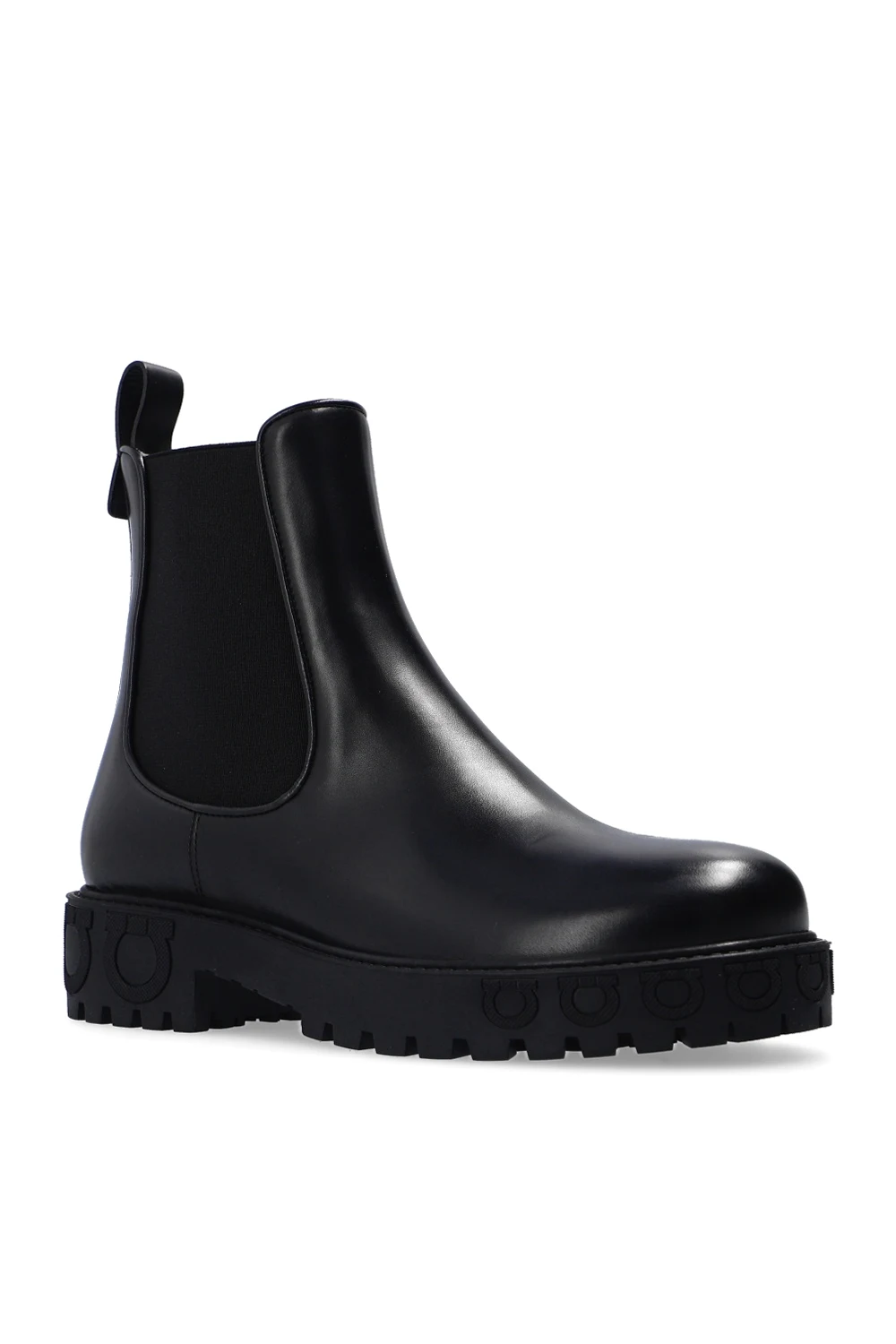 Czarne botki, model 'Varsi' Salvatore Ferragamo. Wykonane z cielęcej skóry. Po bokach wstawki z elastycznego materiału. Czarna, gumowa podeszwa z wytłoczonym logo.