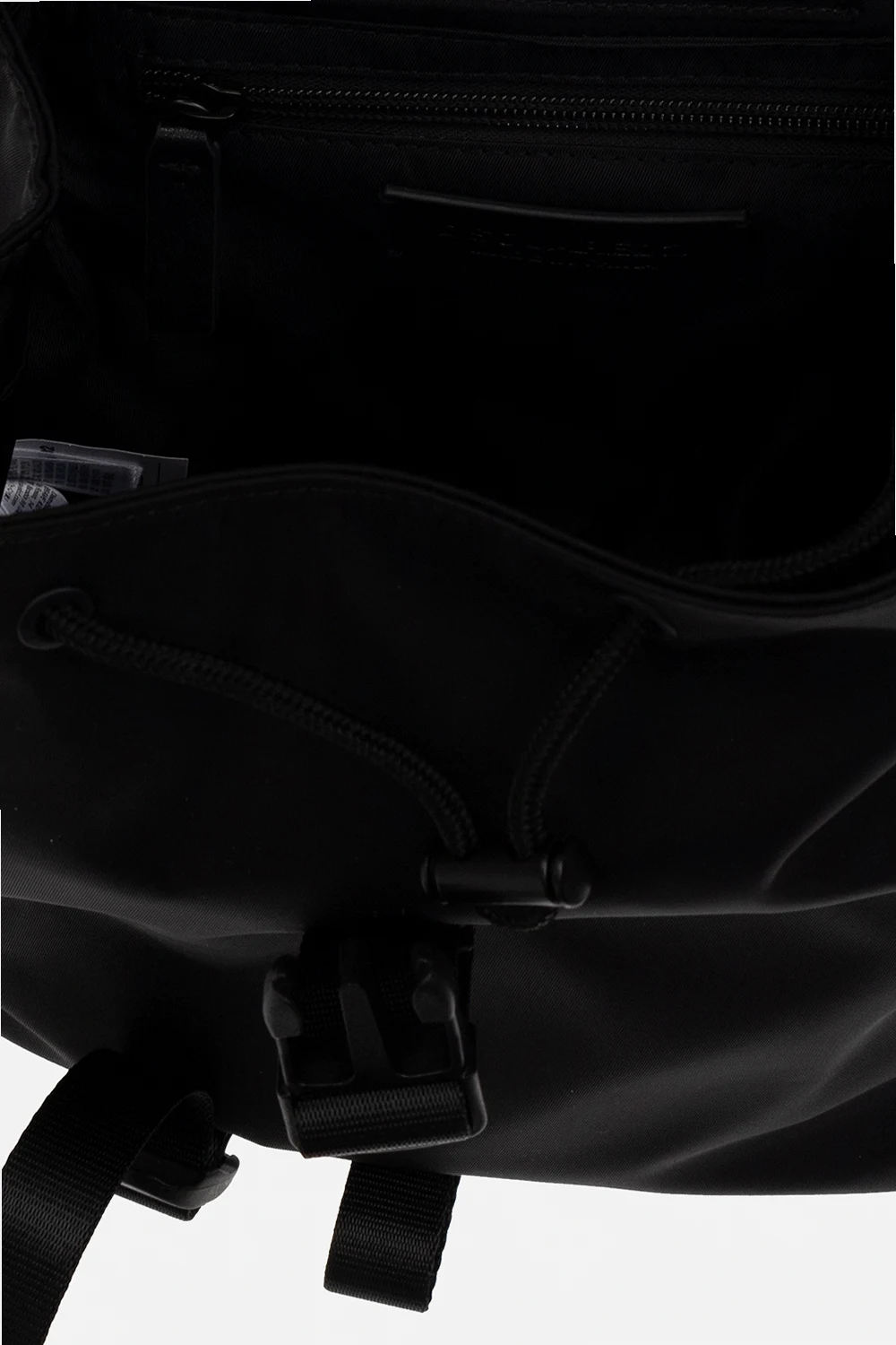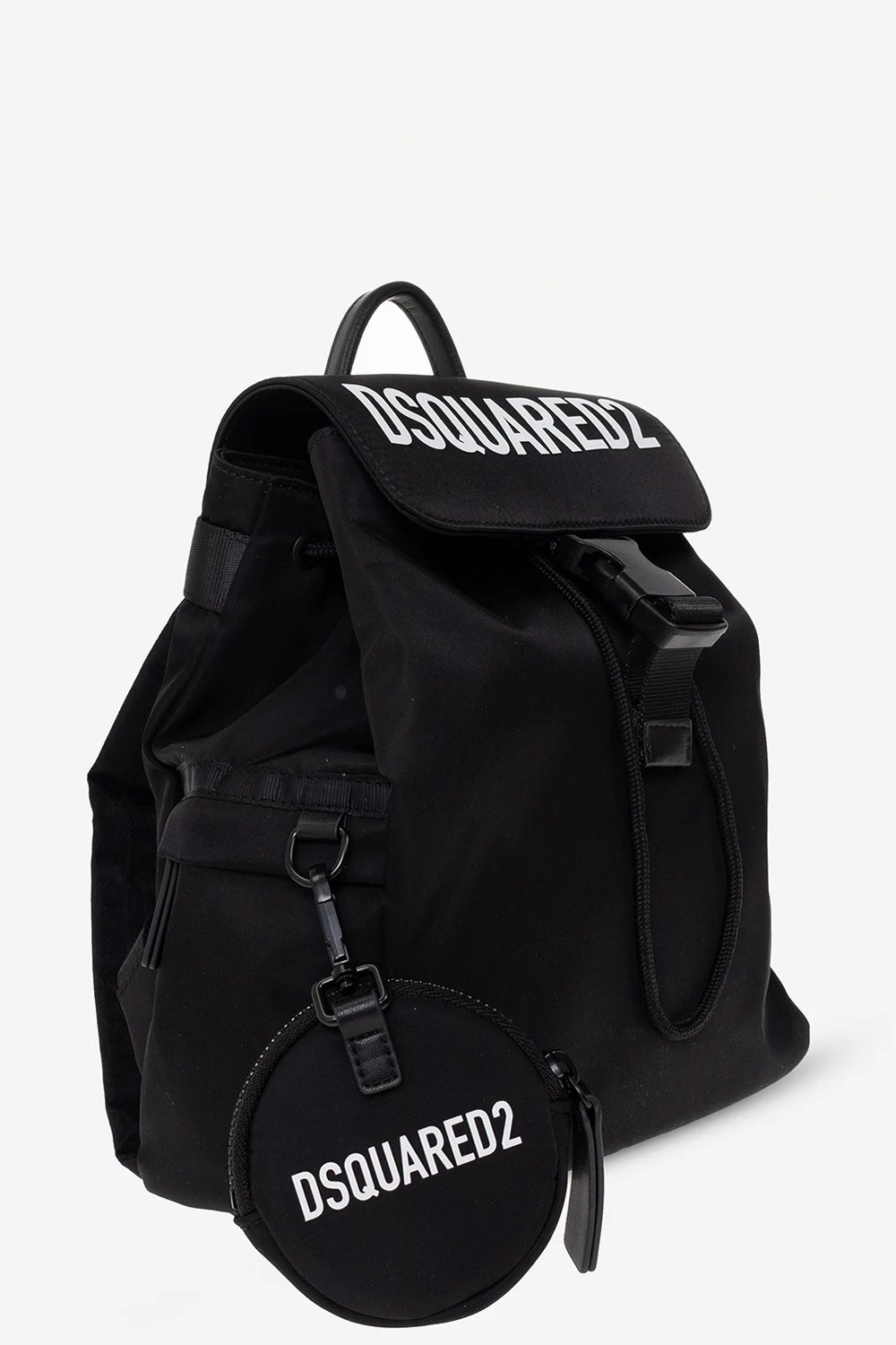 Czarny plecak Dsquared2 Kids. Zapinany na zatrzask. Ozdobiony wzorem z logo w kolorze białym. Szelki z możliwością regulacji długości. Kieszeń zamykana na zamek. Wewnątrz komora ściągana trokami. Metalowe wykończenie w kolorze czarnym.